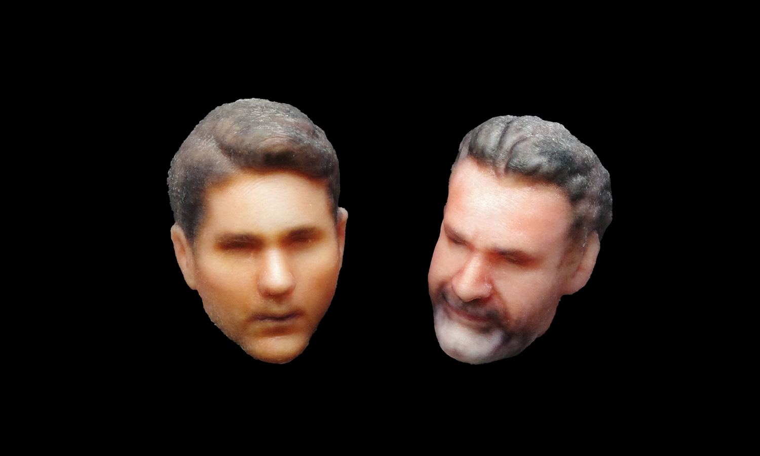 The terrain models display rich surface textures, simulating earth, water, and vegetation, while the heads capture realistic skin tones and hair gradients at an impressive scale of only a few centimeters. Both were printed directly in color, with no post-painting required.