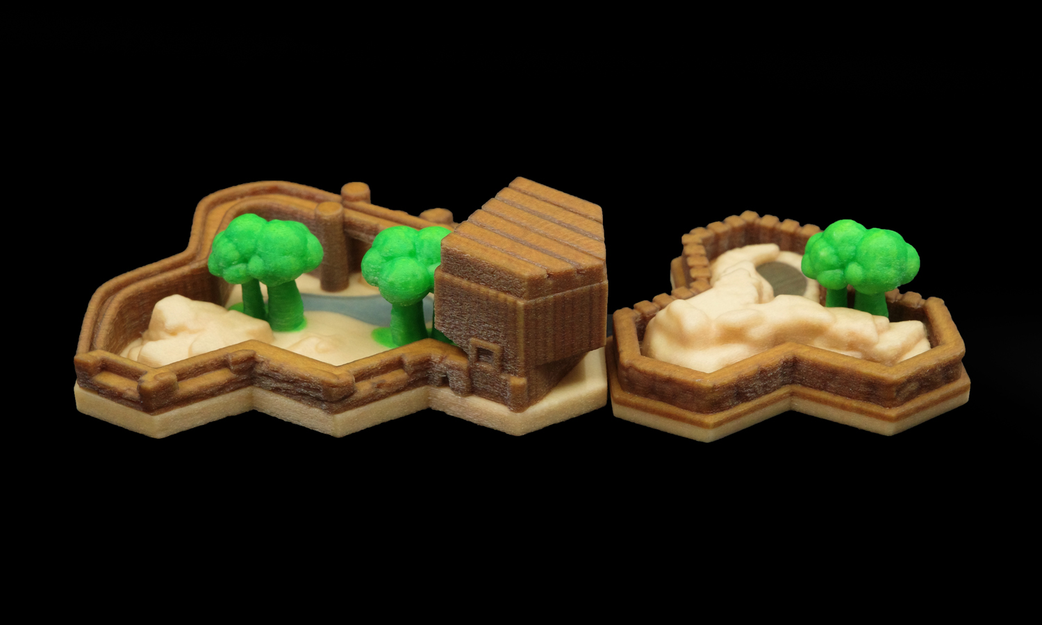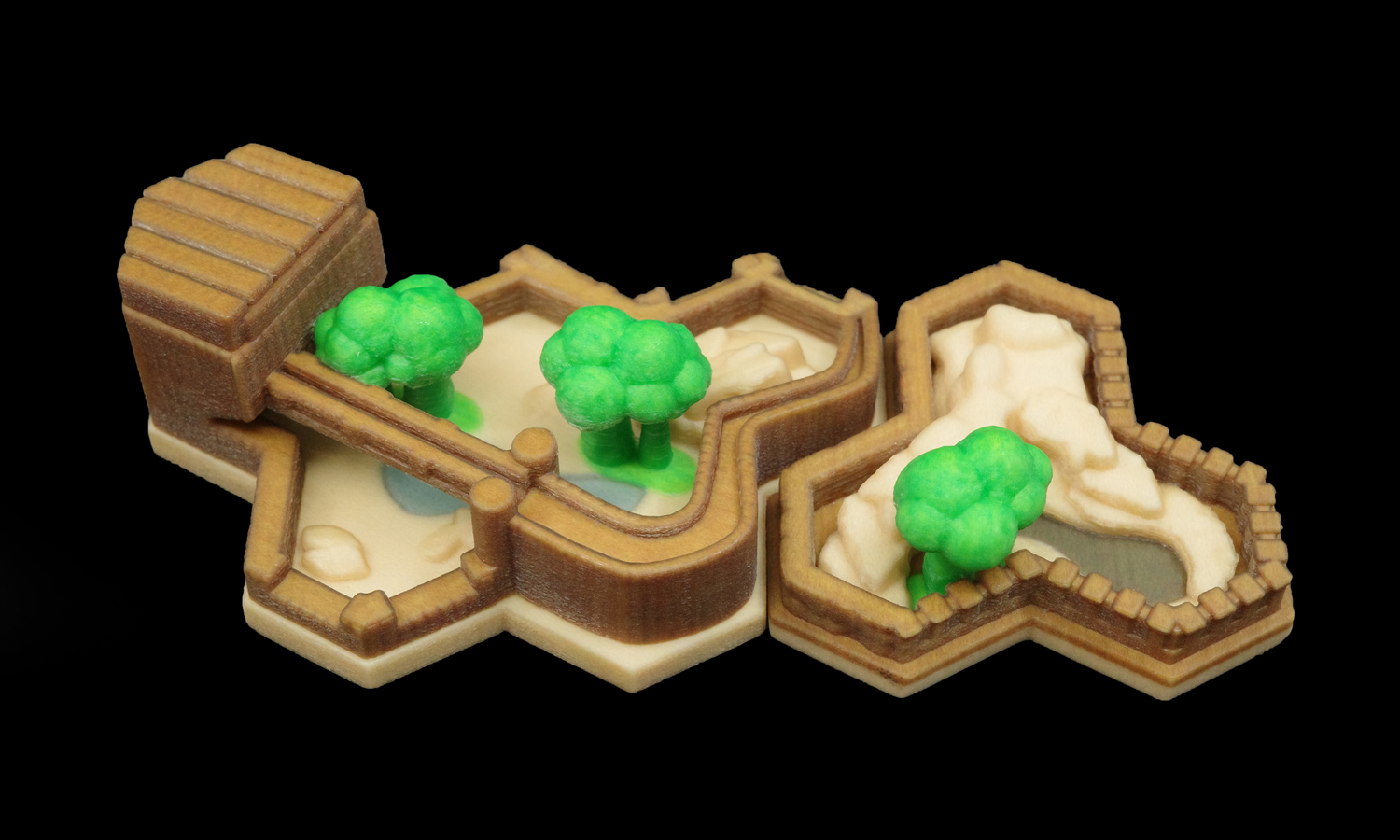 This set of beautifully detailed miniature heads and terrain tiles was produced for a board game project using Full-Color Material Jetting (WJP) technology. Although the exact game remains unidentified, the pieces show clear evidence of a thoughtfully designed world – featuring architectural landscapes, stone formations, greenery, and expressive character heads.