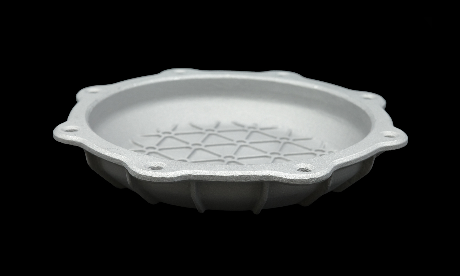 The interior features a high-performance isogrid pattern鈥攁 triangular reinforcement structure famously used in aerospace and satellite design. By utilizing this geometry, the part achieves an incredible strength-to-weight ratio that would be nearly impossible (and prohibitively expensive) to machine traditionally. The exterior is equally functional, featuring integrated cooling fins to dissipate heat and a precision-engineered 8-hole flange for secure, pressure-tight mounting.