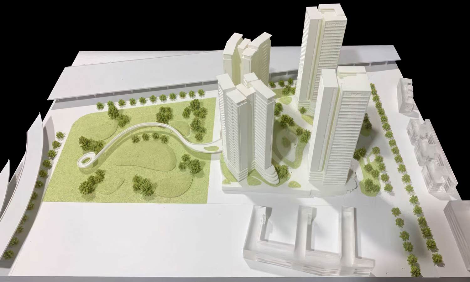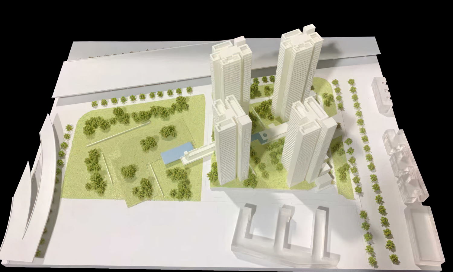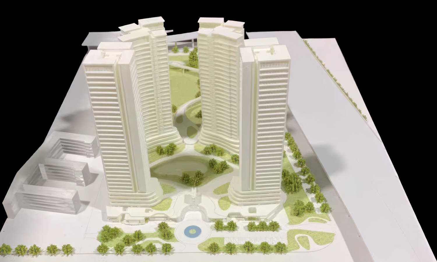 The design features four primary residential towers characterized by a rhythmic, “serrated” balcony pattern. To achieve the sharp edges and smooth surface finish required for such intricate detail, the towers were printed using SLA Generic Resin. This material provides a clean, matte white aesthetic that catches natural light, emphasizing the architectural “mass” and the stepped profiles of the skyscrapers.