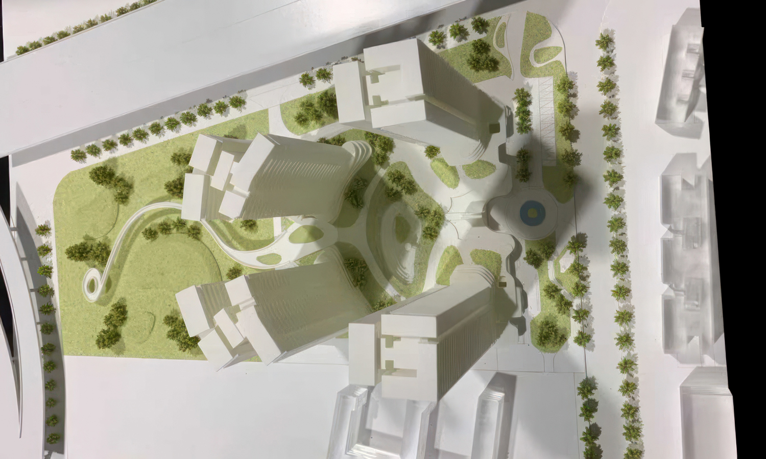 In contrast, the lower-tier peripheral buildings and site context were fabricated with SLA Clear Resin. This material choice creates a sophisticated visual hierarchy; while the main towers stand out as solid landmarks, the translucent surrounding structures appear “ghost-like.” This effectively dematerializes the context, allowing the viewer to focus on the core design while still understanding the project’s spatial relationship with its environment. The central ground plane further enhances the composition, featuring fluid, 3D-printed walkways and a circular water feature that serve as the project’s communal heart.