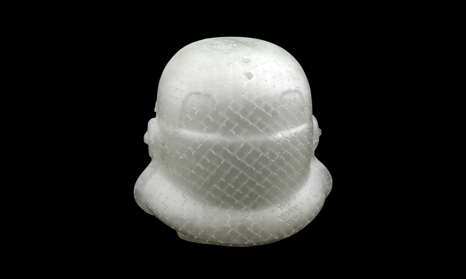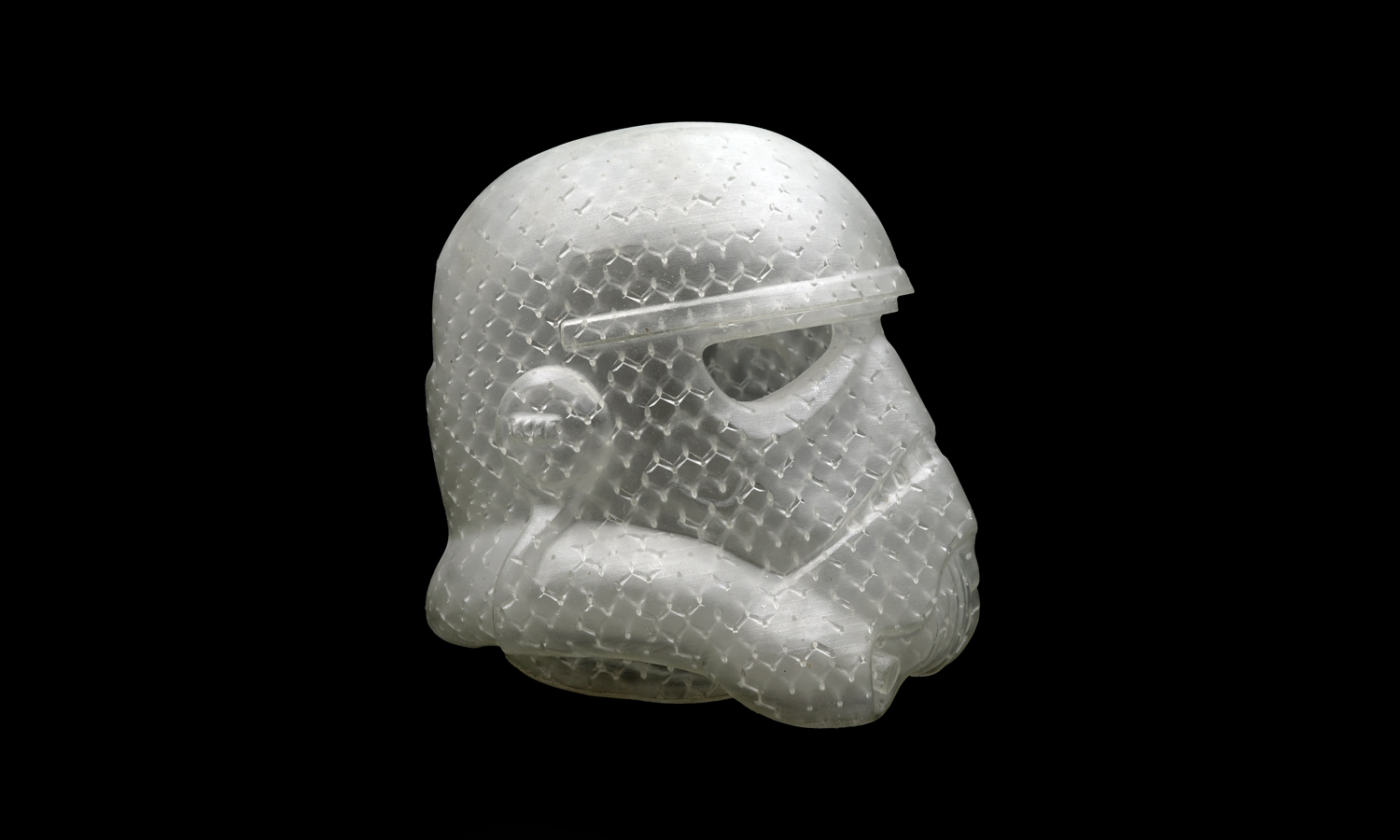 At first glance, the helmet looks like a clean, crystal-like sculpture. But look a little closer and you’ll notice a delicate geometric texture flowing beneath the surface. This isn’t decorative infill-it’s the engineered hexagonal lattice that makes QuickCast patterns so effective for investment casting. The lattice supports the thin outer shell, controls shrink stress, and ensures the resin burns out smoothly during metal casting. When printed in a clear resin and lit from the front, this functional structure becomes a striking design feature all on its own.