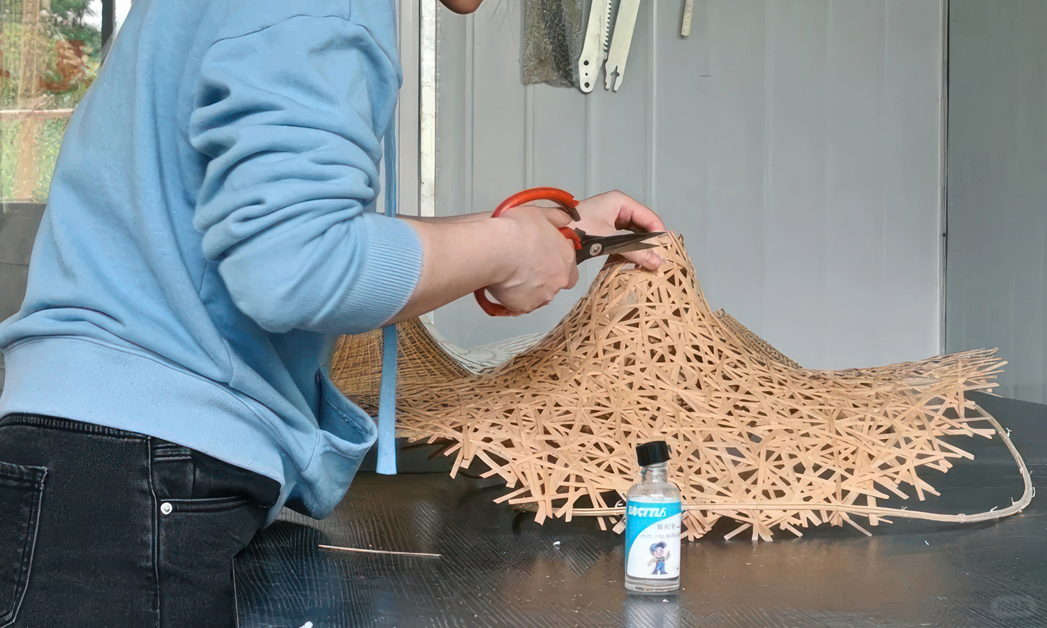 - Step 1: The curved surface geometry was digitally modeled in CAD software, with precise grid spacing to support bamboo weaving.