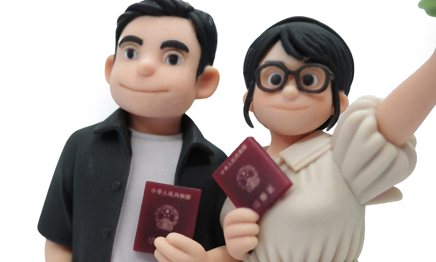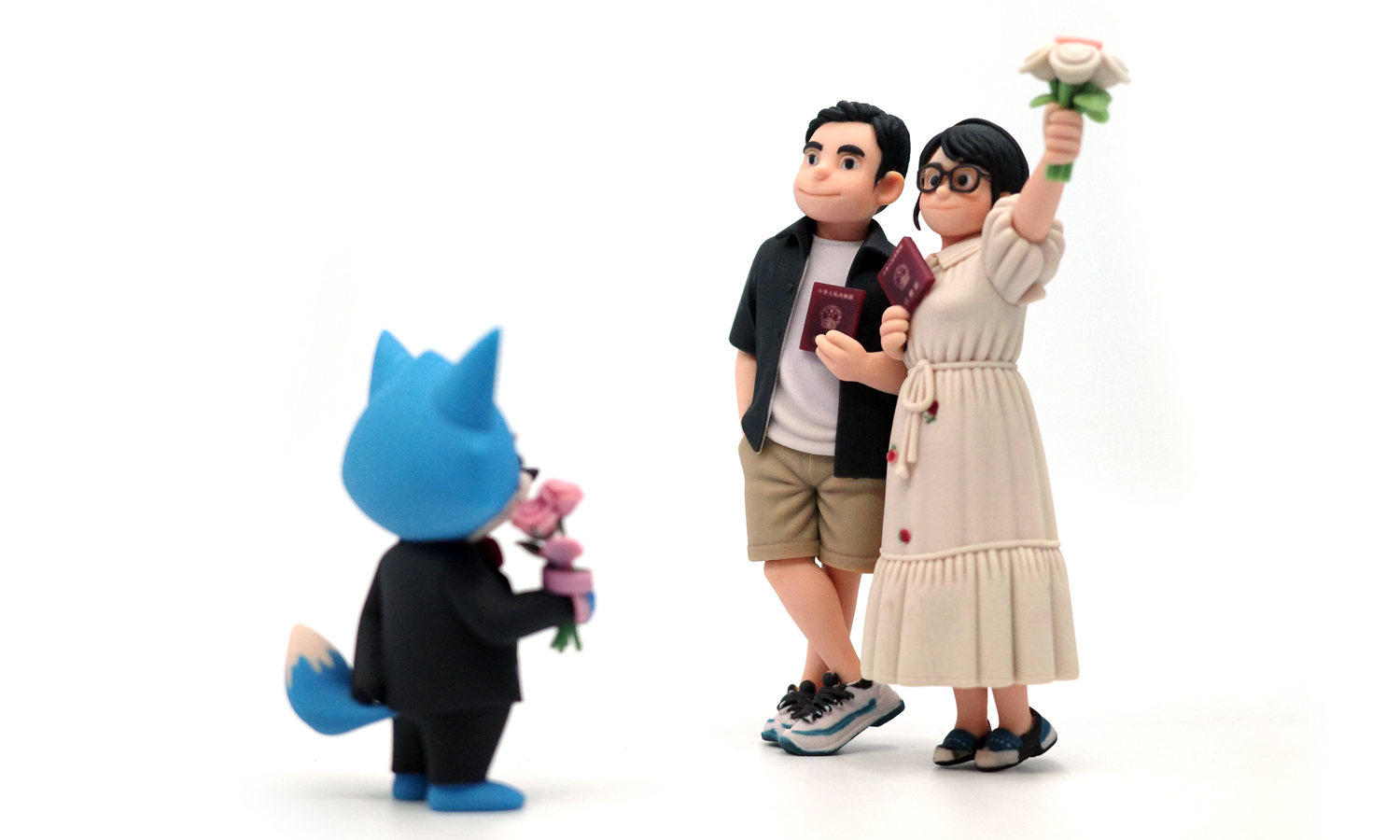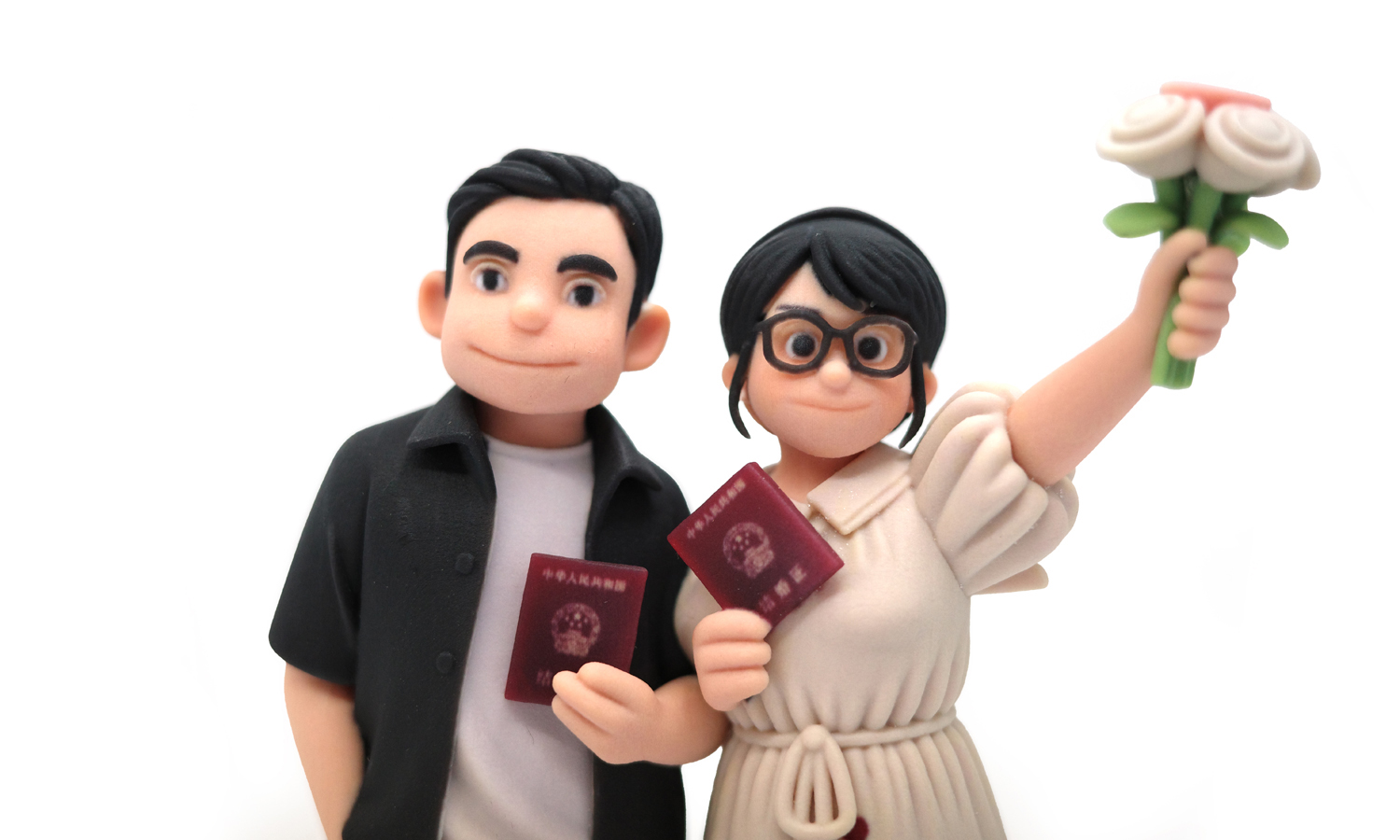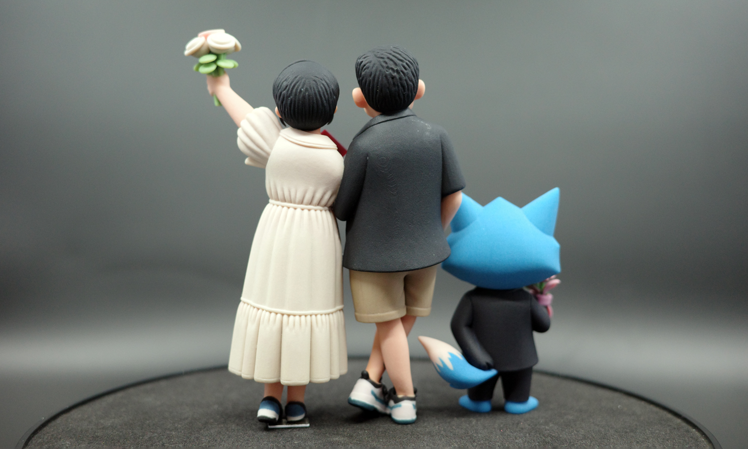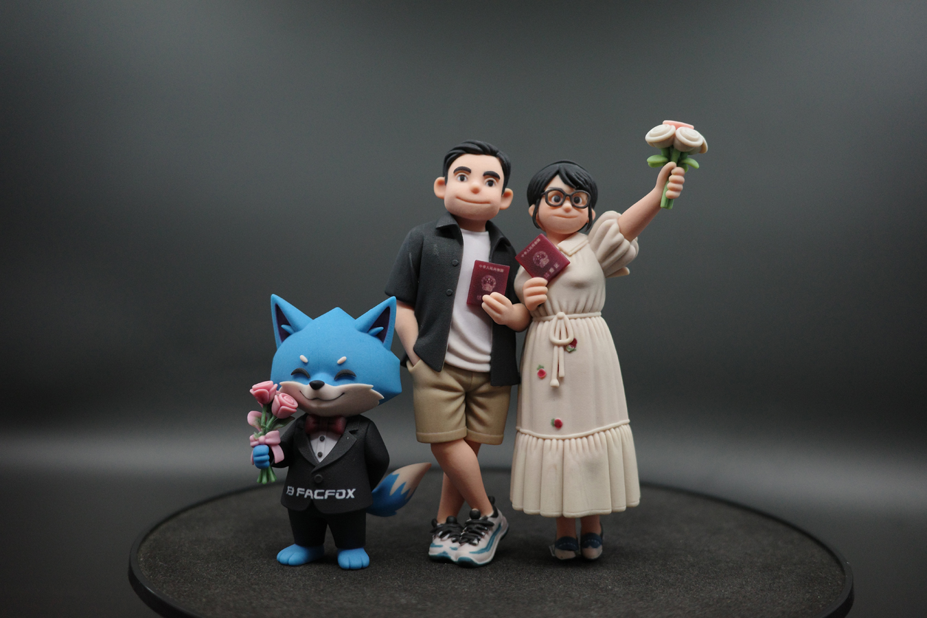 The final figures were produced with FacFox’s WJP full-color 3D printing service, which captures every hue and texture in remarkable detail. The printing precision was so high that you can even read the characters on the miniature marriage certificates.