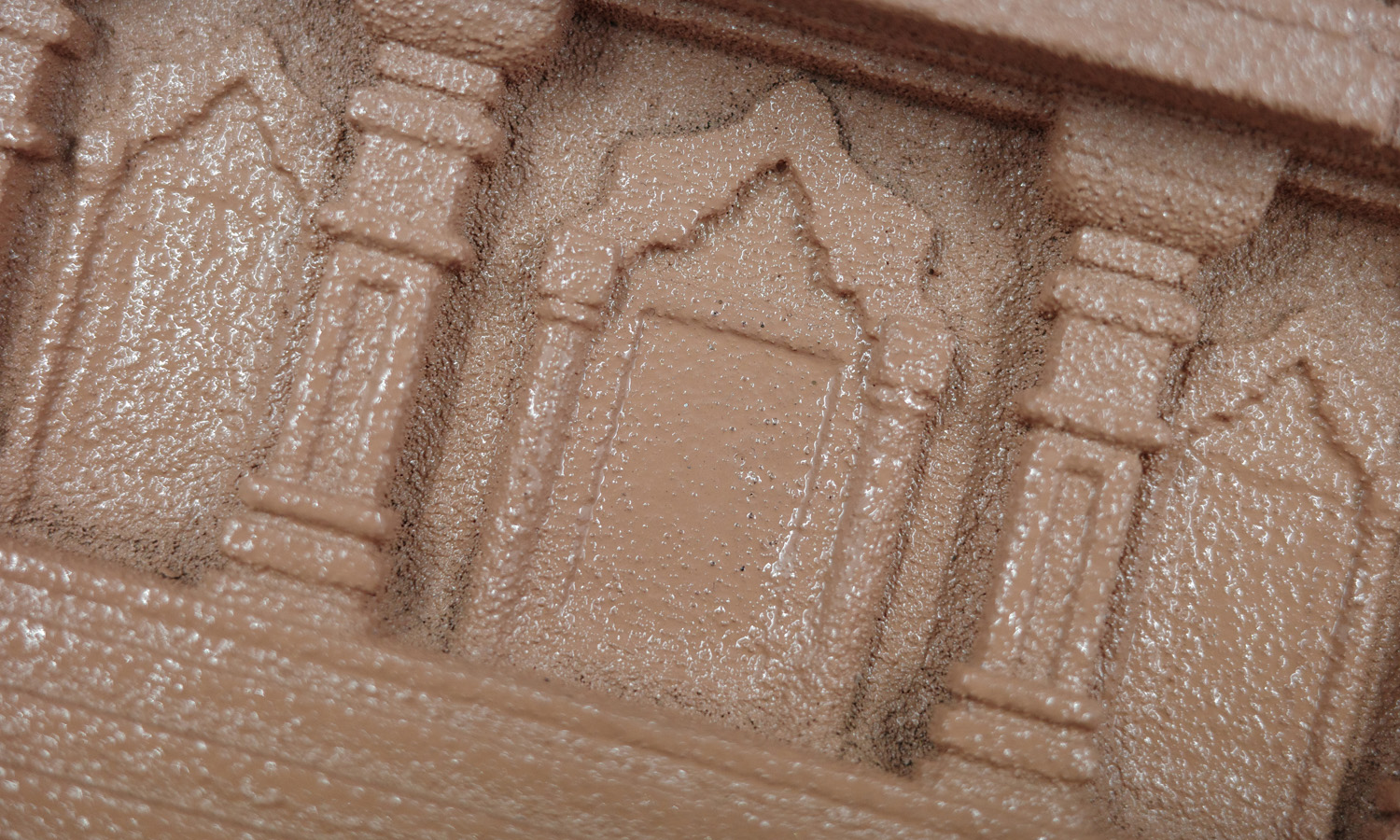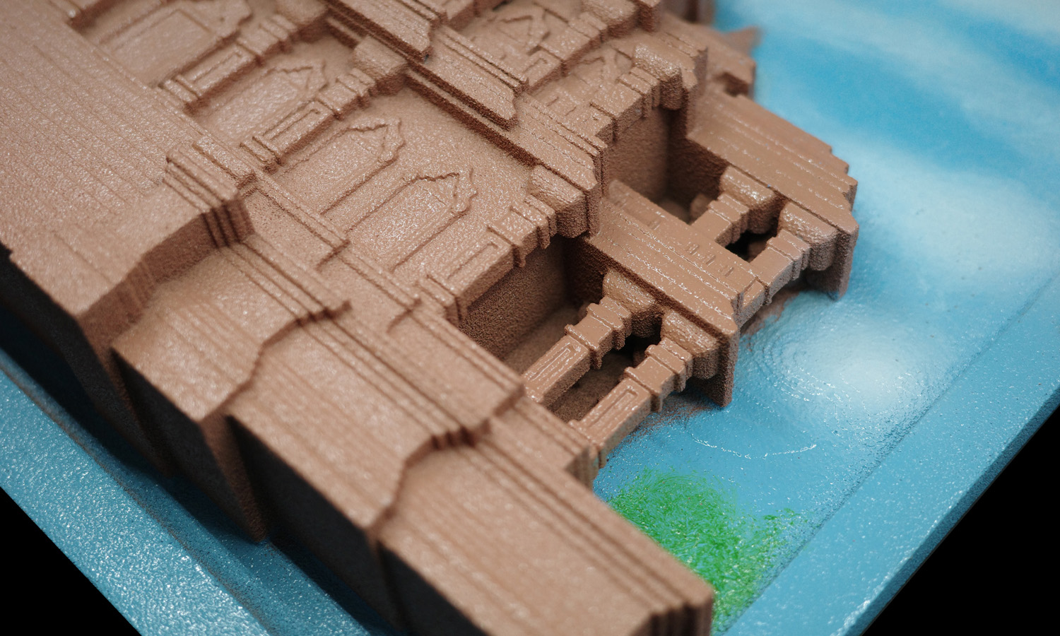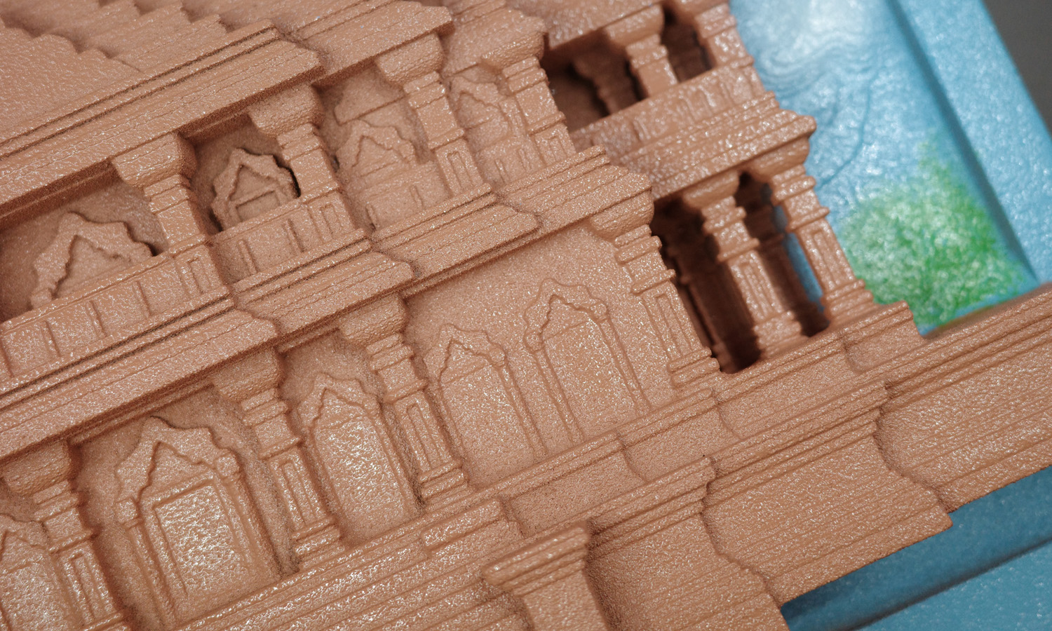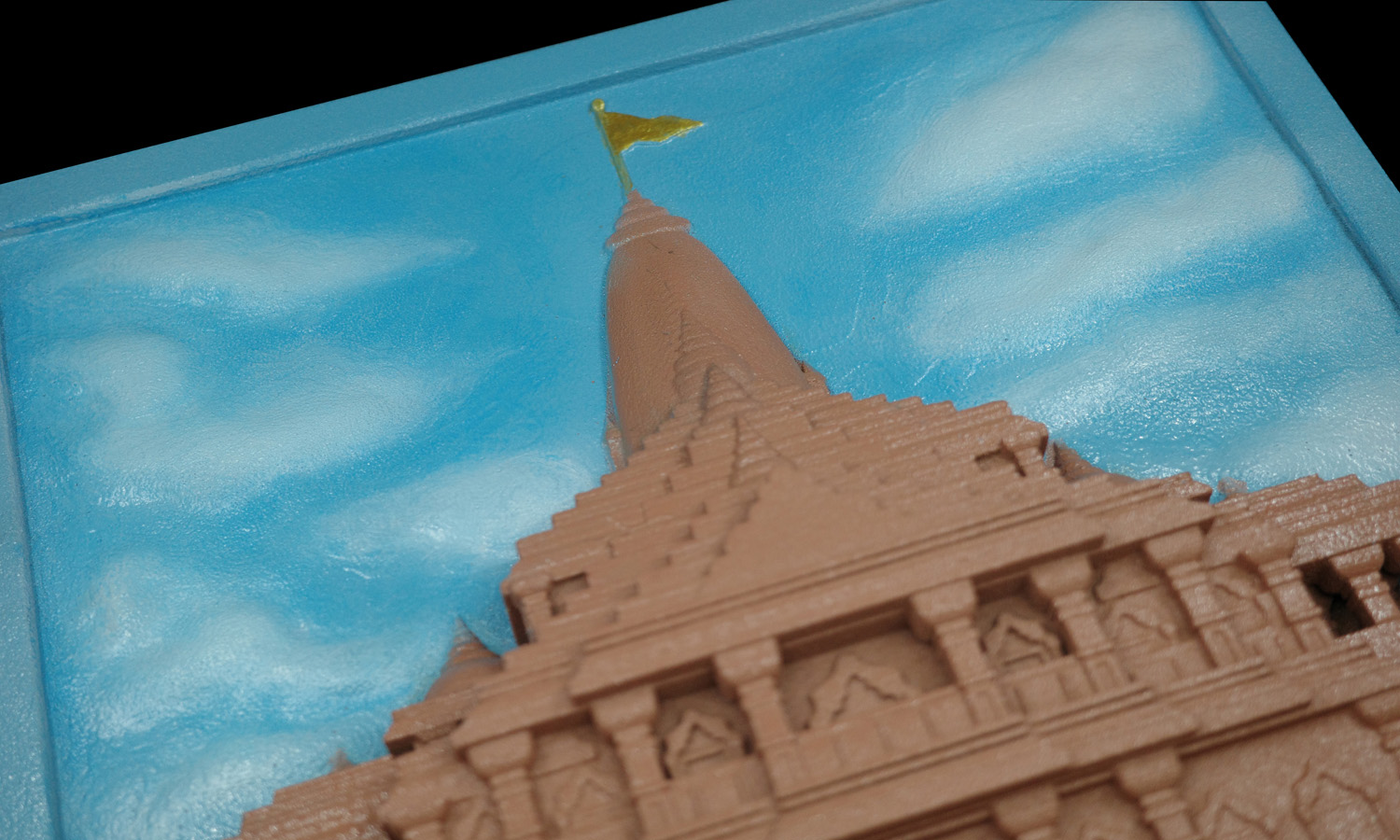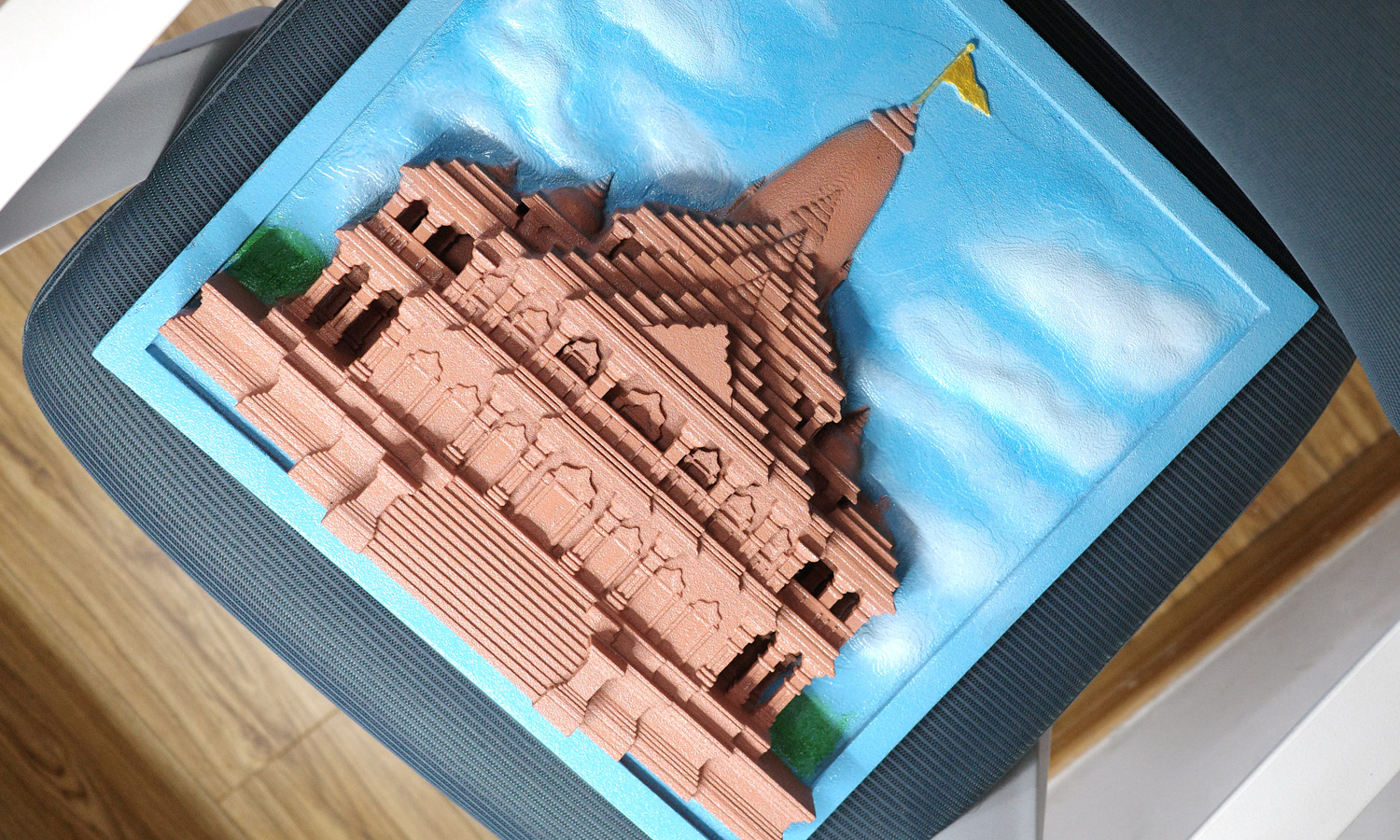 This temple relief was produced using ColorJet 3D printing (CJP sandstone), based on a client’s original 3D model. The print accurately captured the layered geometry of the temple – from the stairways to the domed spire – showcasing the precision and surface fidelity of the sandstone printing process.
