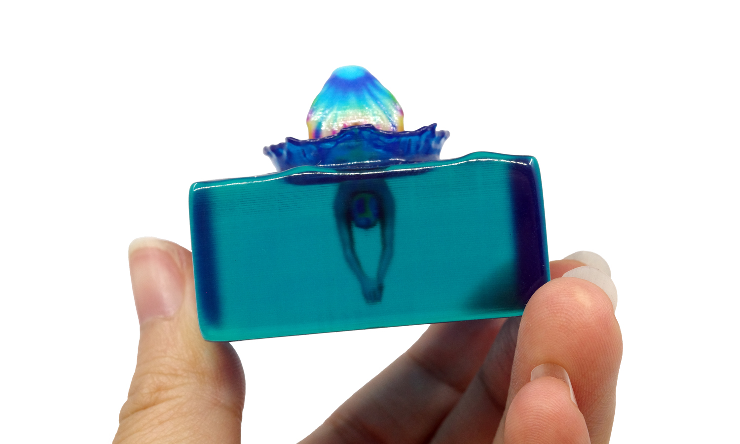 While the initial print demonstrated the incredible color capabilities of UV inkjet technology, this round focused on depth. We polished the top and bottom surfaces to a high gloss and sealed them with a thin layer of acrylic oil. This treatment allows light to pass through with minimal scattering, making the mermaid appear convincingly suspended in a liquid volume-an effect far more reminiscent of cast resin than a standard 3D print.