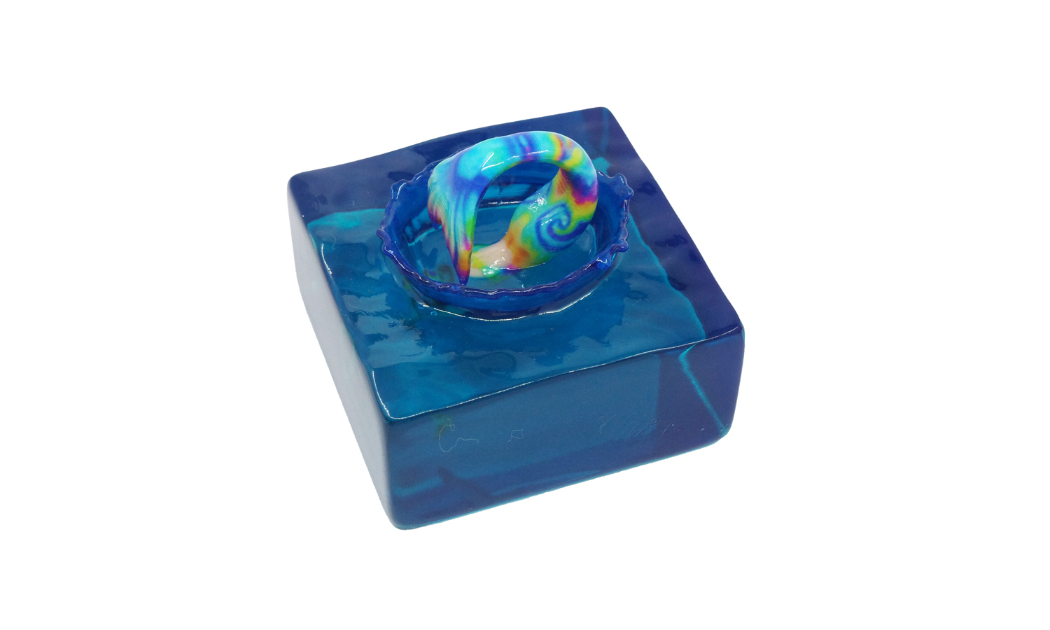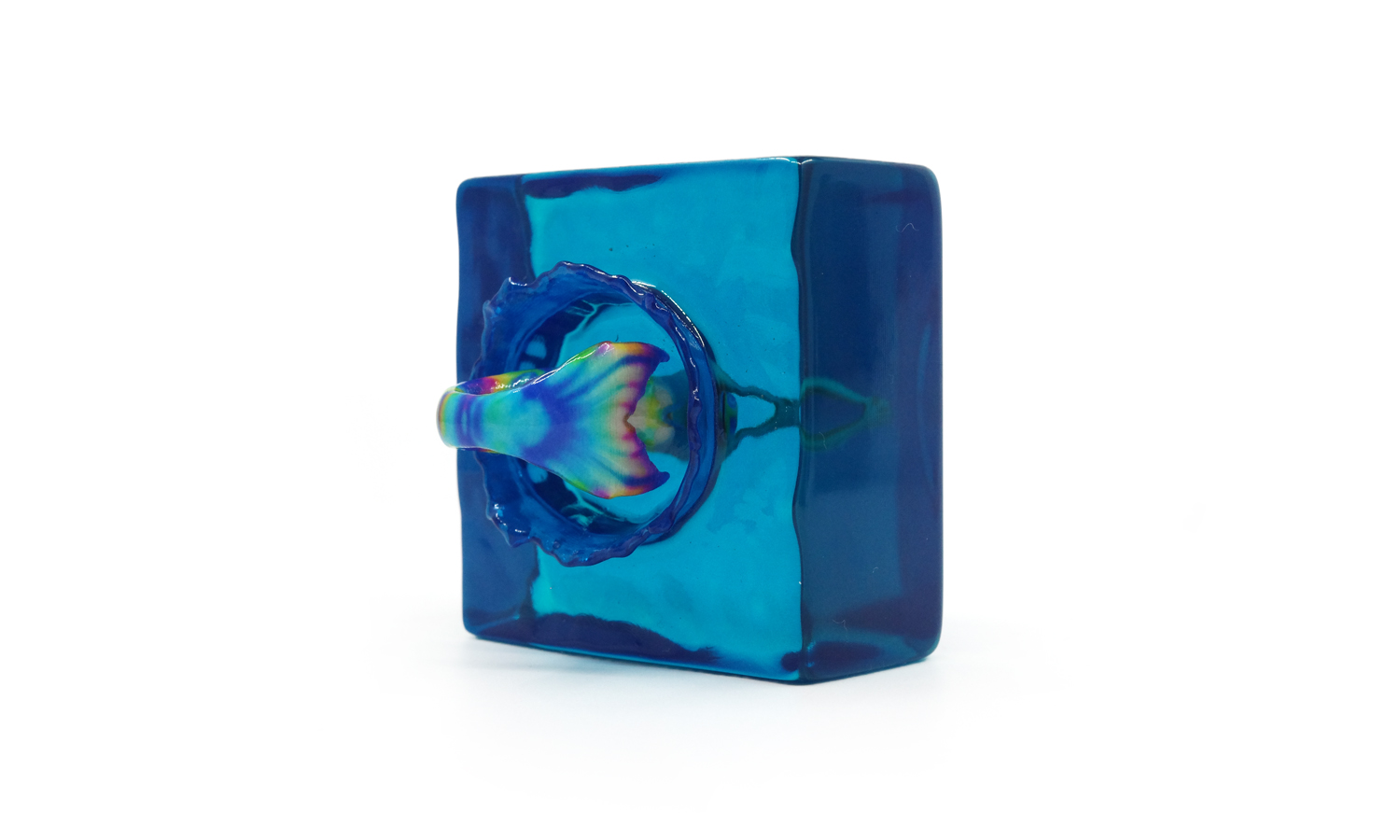 In a deliberate aesthetic contrast, the four side faces were not thoroughly polished. By leaving the subtle layer lines intact, these faces act as a frosted lens, diffusing light and blurring the mermaid into an abstract silhouette. This creates a fascinating directional experience: absolute clarity from the top, and a textured, “process-honest” view from the sides. The acrylic oil unifies the saturation without softening the crisp, square geometry of the base.