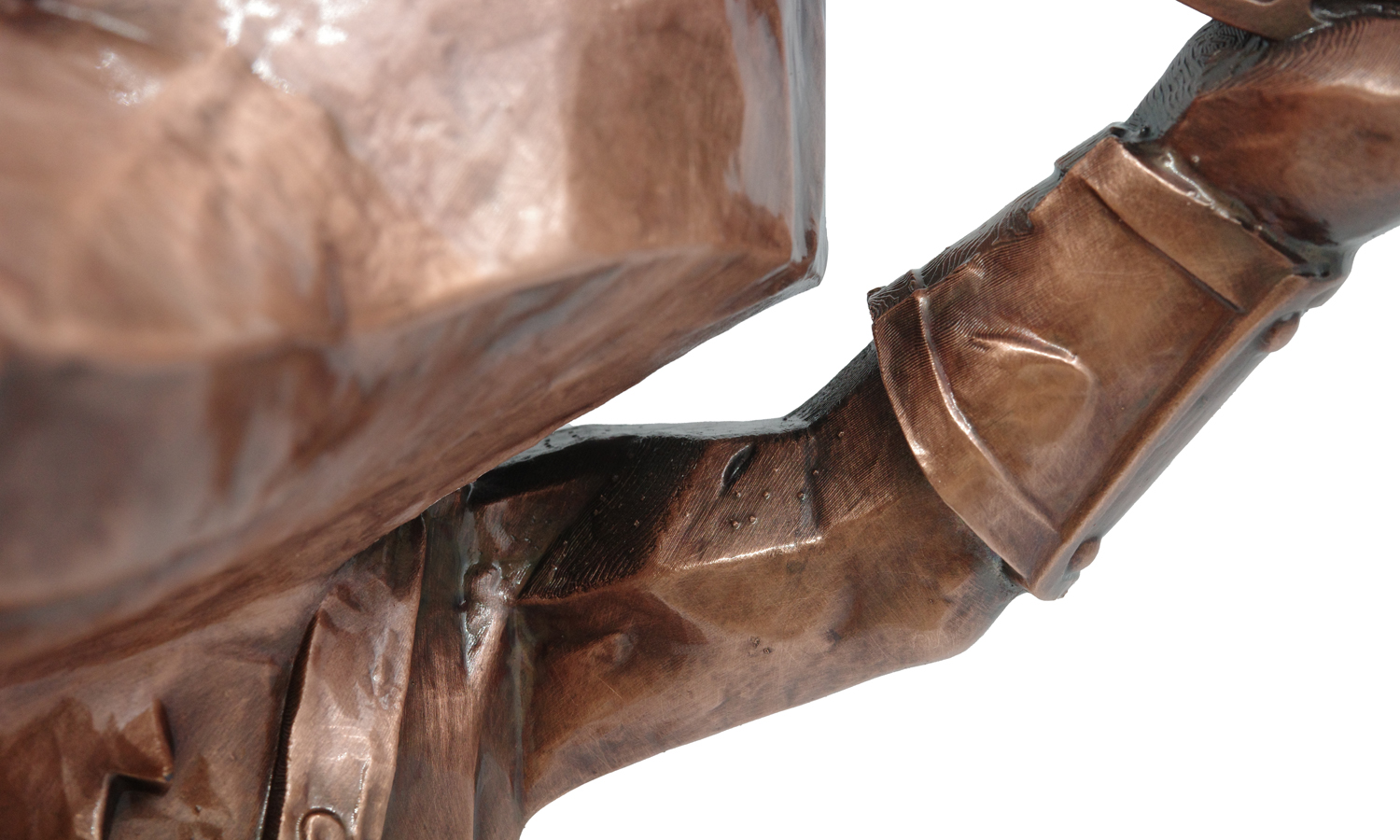 At a normal viewing distance, the illusion of cast metal is convincing. The faceted planes reflect light in a way that emphasizes the design, while the aged copper finish adds depth and visual weight. Close inspection reveals traces of the underlying additive process, such as support marks and mounting holes on the feet, which are characteristic of plated resin workflows. These details reflect the balance between manufacturability and surface refinement in complex, multi-step fabrication.