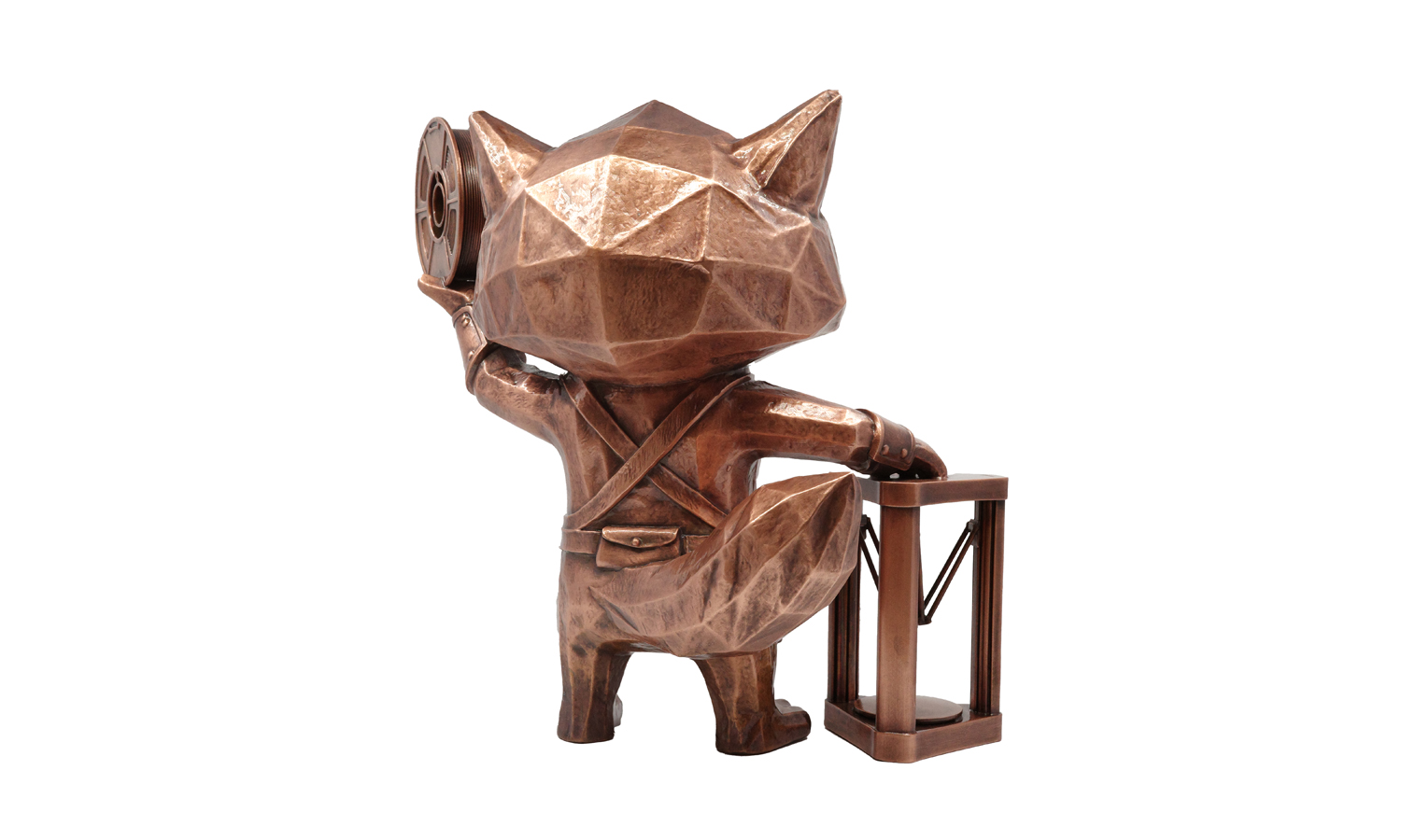 This fox statue was produced through a hybrid process that combined resin 3D printing, electrolytic copper plating, and a controlled aging treatment. The original resin print captured the character’s low-poly geometry and expressive pose, providing a precise base for later surface transformation. After printing, the part was prepared and plated with real copper, forming a continuous metallic skin rather than a simple paint layer.