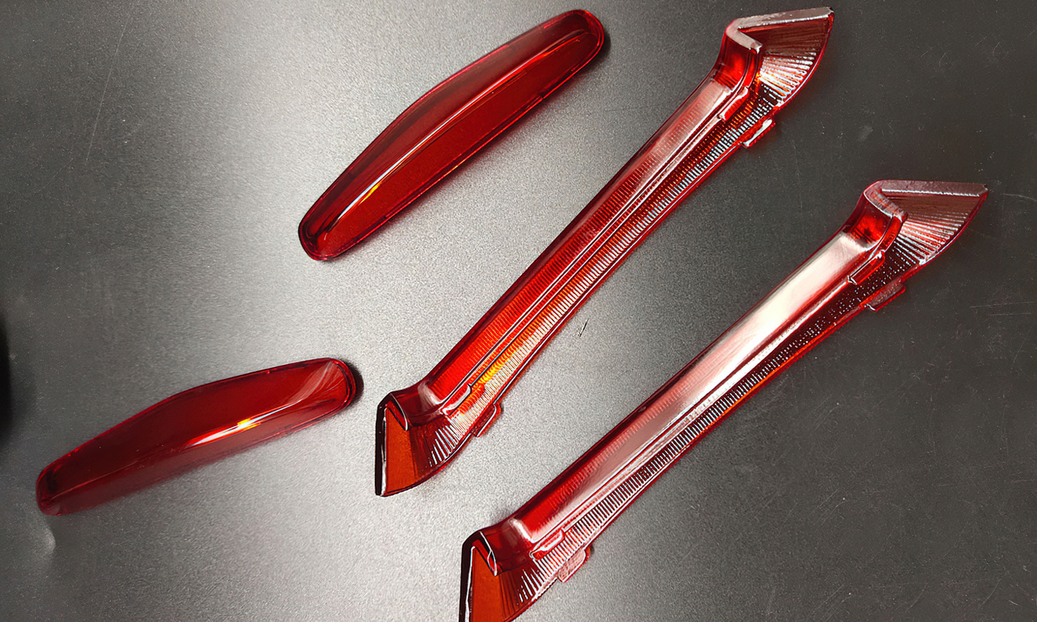 Automotive design demands not only precision but also visual performance. In this case, a series of transparent red components were produced to prototype various car lighting elements – from tail light covers and reflectors to signal lamp housings. These parts were used for design validation and optical testing before the final injection molding stage.