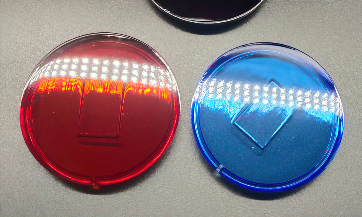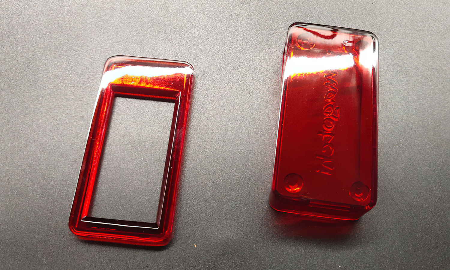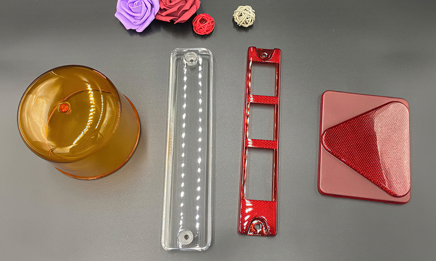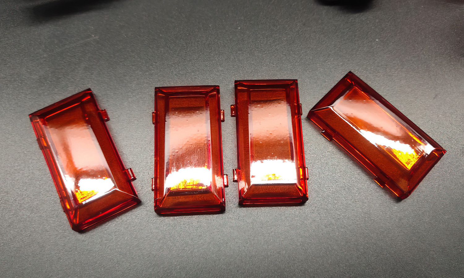 The prototypes were later tinted in translucent red and amber shades to emulate functional lens covers. After polishing and coating, they achieved excellent optical transmission and a smooth, glass-like surface quality suitable for both presentation and performance evaluation.