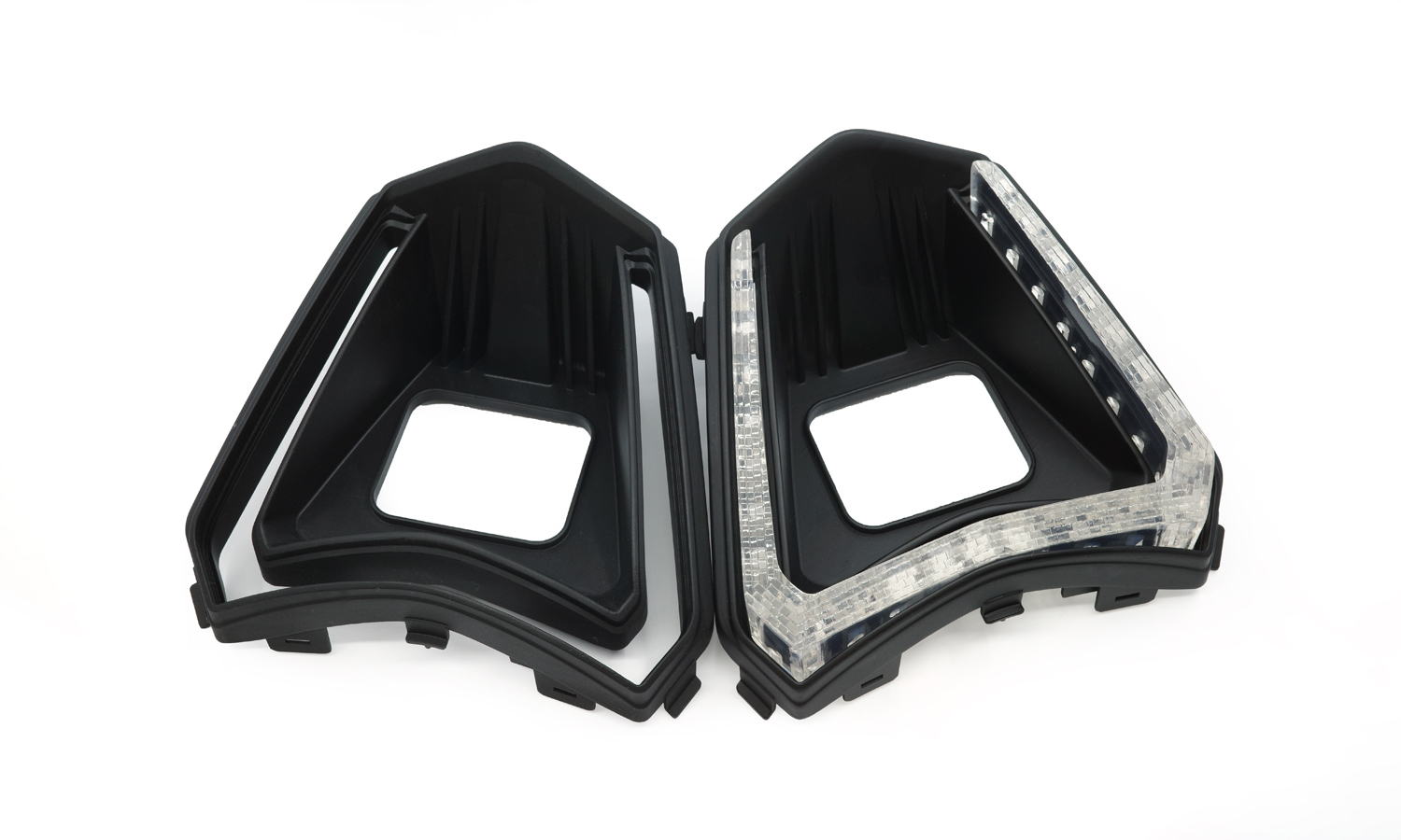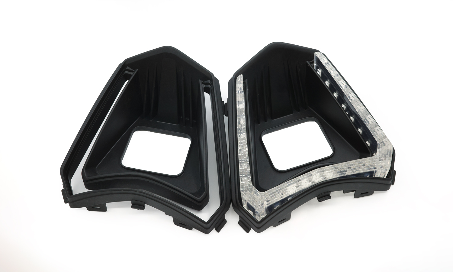 This project features a transparent, angular light-guide component designed as part of a motorcycle lighting system. The clear part was engineered to assemble precisely with two black structural housings, forming a complete lighting module that balances optical performance, mechanical stability, and visual clarity.