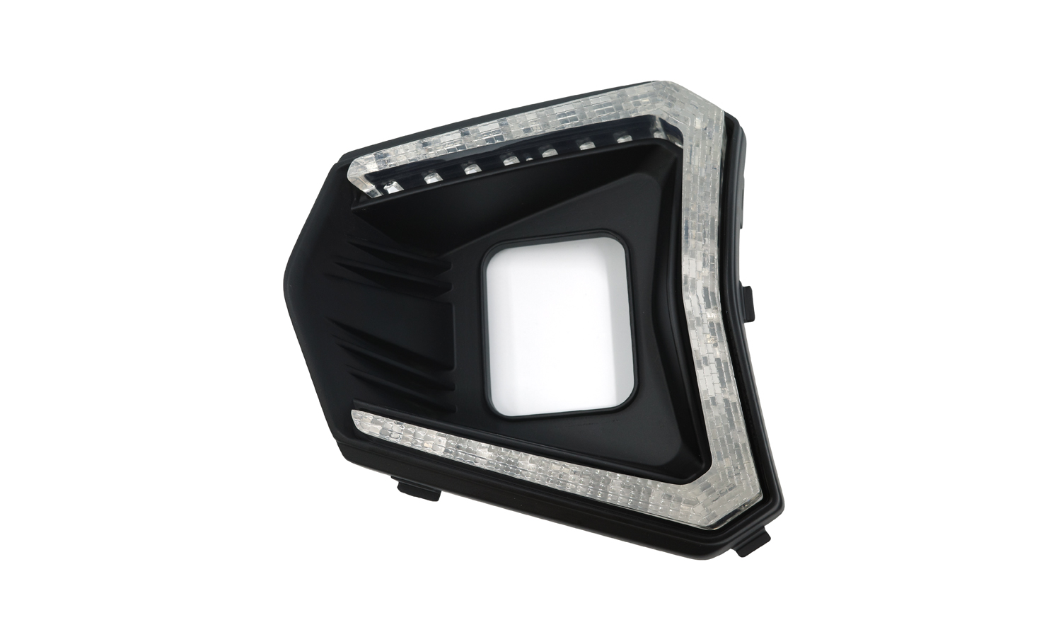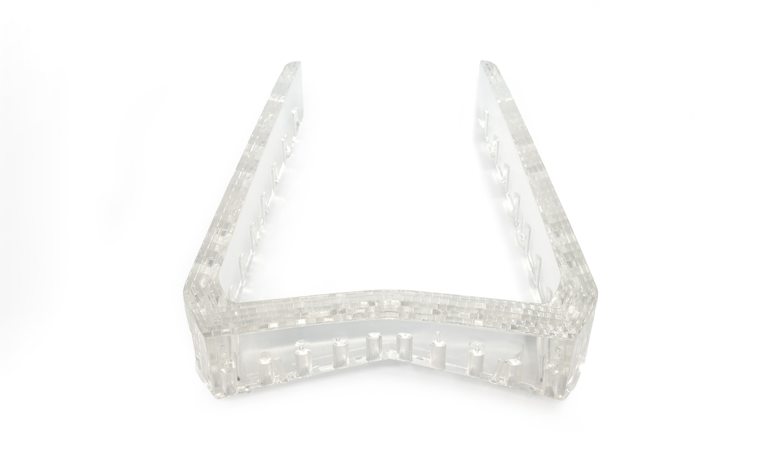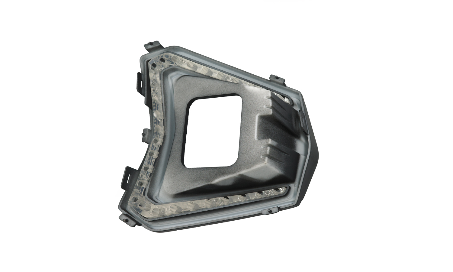 The transparent component followed a sharp, faceted geometry that matched the contours of the outer housing. Along its inner edges, a series of evenly spaced micro-posts and ribs were integrated to align with the mating parts during assembly. These features ensured accurate positioning of LEDs and consistent light distribution once installed, while also improving structural rigidity without adding unnecessary bulk.