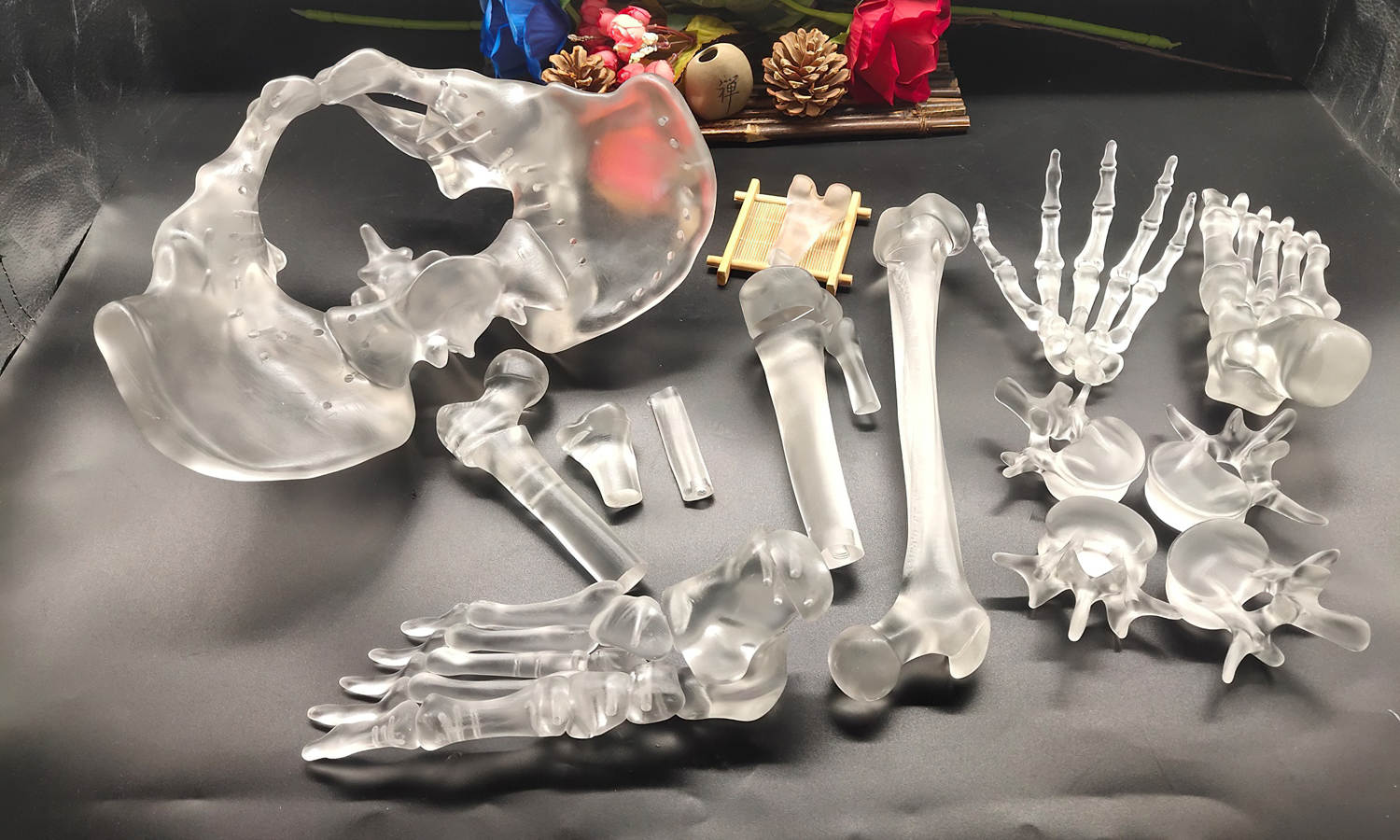 The first example features anatomical bone models printed in clear resin. With their smooth, frosted finish and fine anatomical details, these parts are ideal for medical training, surgical planning, and museum exhibits. The semi-transparent surface allows educators and professionals to study both the external and internal structures simultaneously.