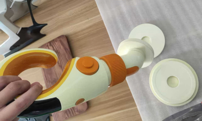 - Step 7: The final assembly was completed by joining the high-gloss handle, the orange adjustment ring, and the vacuum base to create the functional prototype.