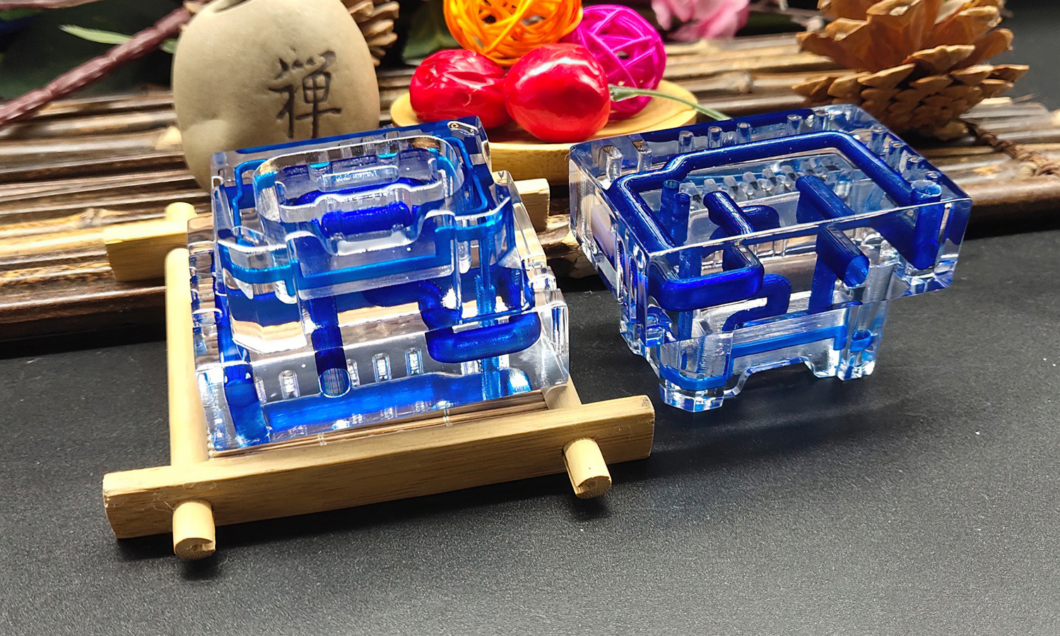 Placed beside a small basketball figurine for scale, these models clearly demonstrate the precision, optical clarity, and layer uniformity achievable with high-resolution SLA printing. The internal tubes, junctions, and curvature transitions are all visible through the polished resin surface, allowing engineers to verify channel geometry, flow paths, and potential pressure-drop points before committing to costly mold machining.