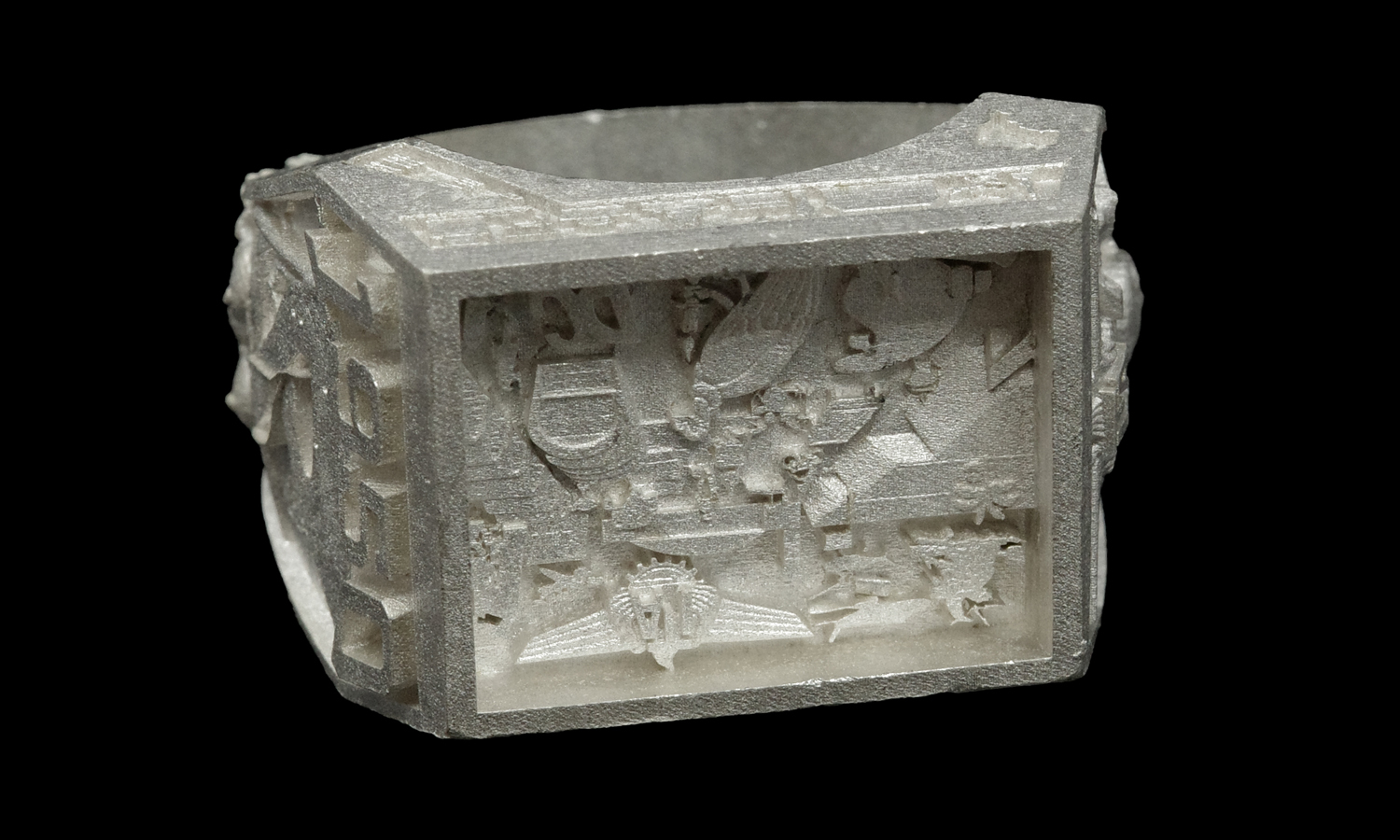 The ring embodies digital artistry translated into craftsmanship, merging sculptural storytelling with technical precision. Its layered cityscape and commemorative motifs showcase how complex symbolism and narrative depth can be miniaturized through high-resolution 3D printing – achieving results impossible with manual carving alone.