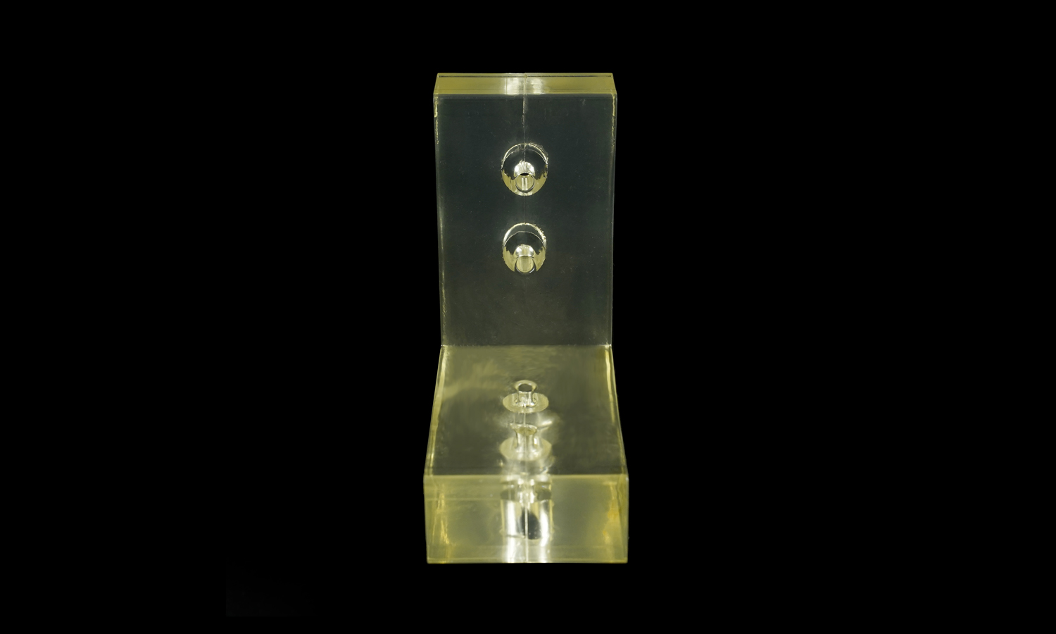 The design includes multiple threaded or insert-ready holes positioned along both vertical and horizontal planes, allowing it to serve as a fixture, bracket, or optical alignment component. Such transparent brackets are often used in engineering validation, optical instrument prototypes, or mechanical assemblies that require precise internal observation- for example, verifying how light or fluid passes through the structure or testing the fit of embedded parts.