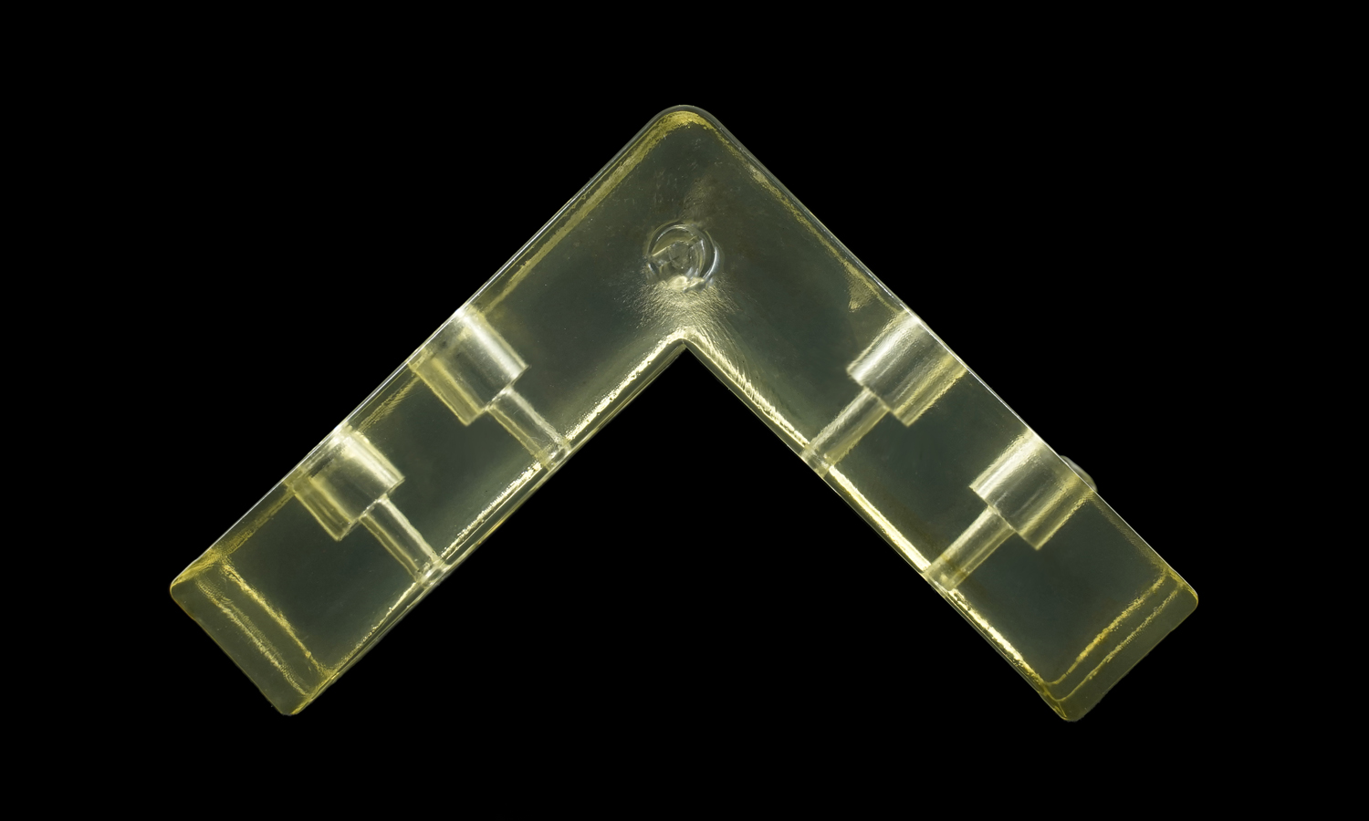 This L-shaped transparent component demonstrates the precision and clarity achievable through vacuum casting. The part features a compact right-angle structure with smooth outer surfaces, embedded cylindrical holes, and clean internal channels that remain visible through the resin body. Its appearance is similar to acrylic but slightly warmer in tone, suggesting a high-grade clear polyurethane or epoxy resin.
