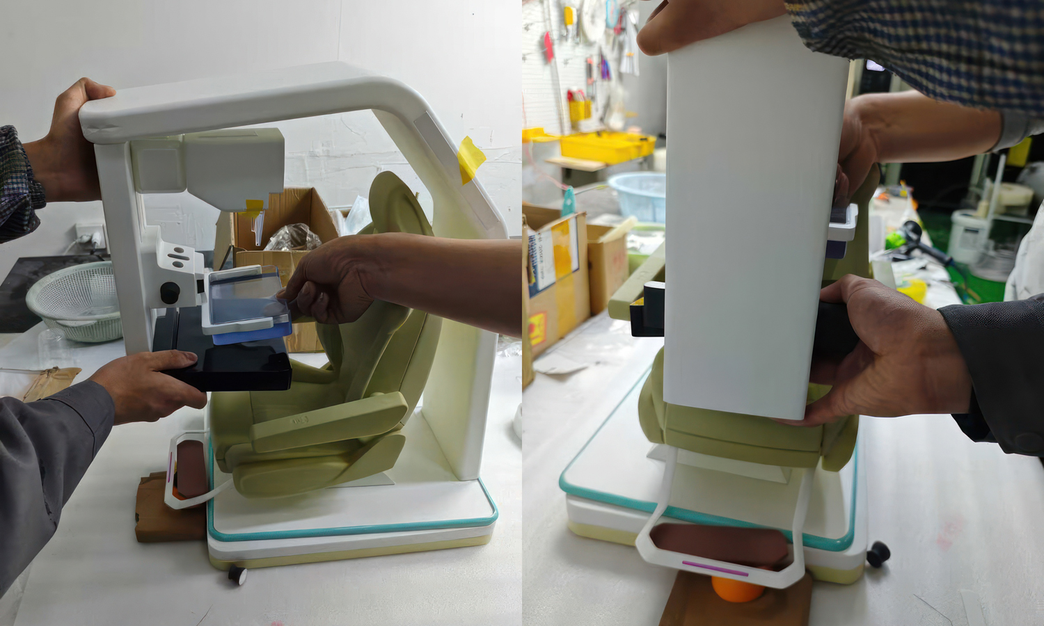 - Step 9: The individual SLA components, including the mechanical rails and padded inserts, were assembled into the final scaled-down prototype.