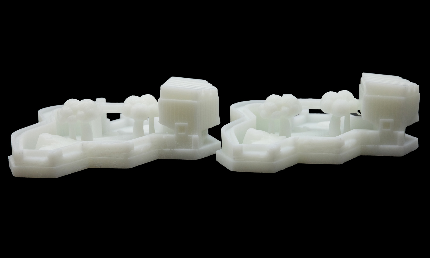 Left model: 0.1 mm layer thickness – slightly glossier due to more pronounced layer lines, which reflect light more easily.