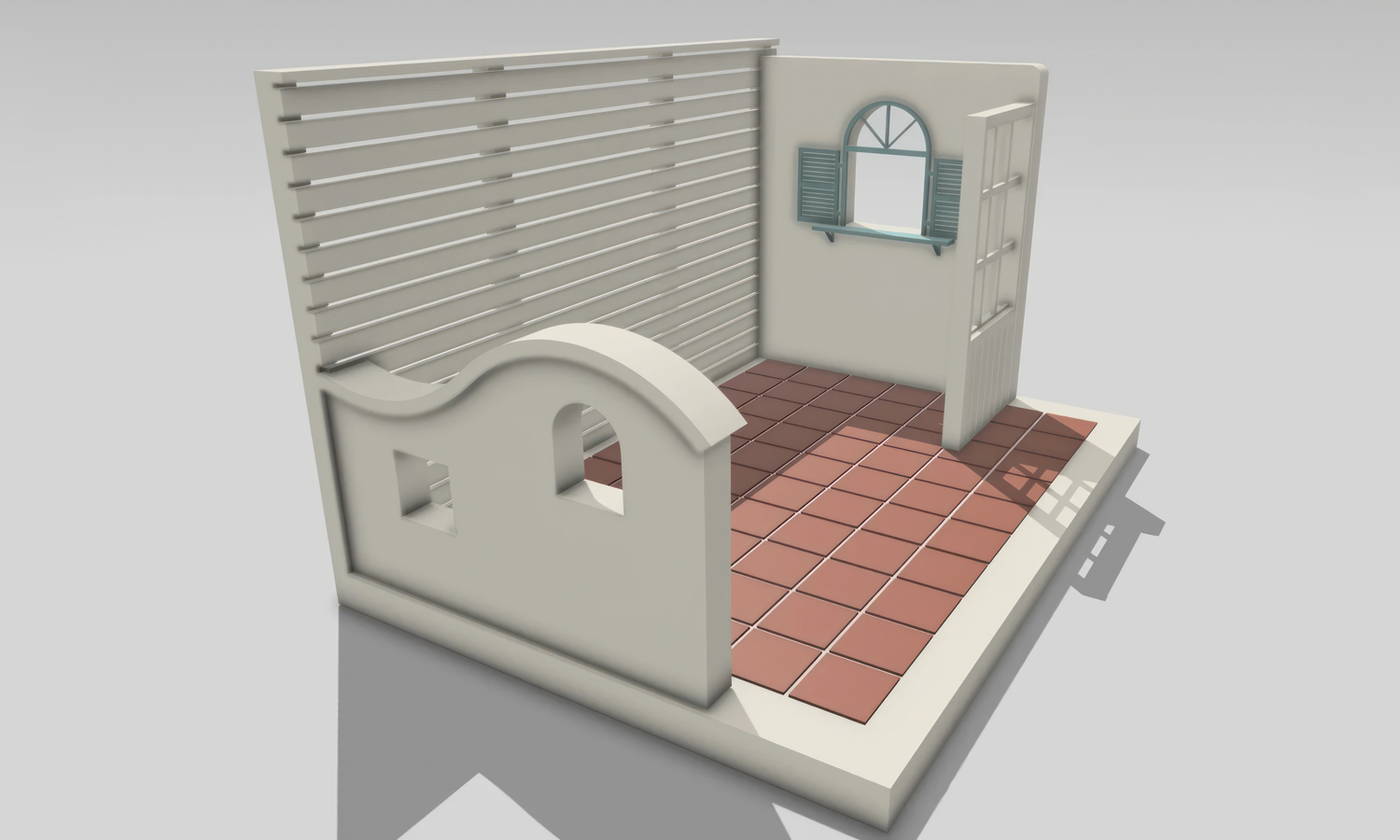 This charming Mediterranean-style miniature patio began as a digital concept, designed to capture the warmth of sunlit walls, rustic terracotta tiles, and the breeze through open shutters. The creator envisioned a cozy, seaside atmosphere-complete with a curved courtyard wall, grid-paned door, and wood-slatted backdrop reminiscent of Greek island cottages.