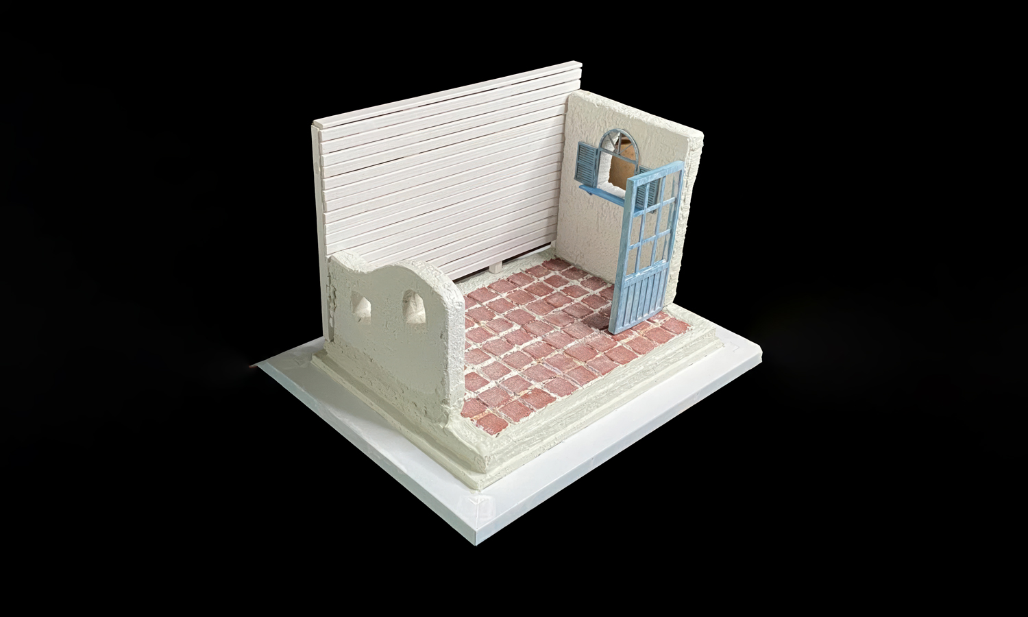 - Step 14: Painting was completed. Terracotta tones were airbrushed on tiles; stucco was finished in warm off-white; the door and shutters were painted pastel turquoise with panel-line accents.