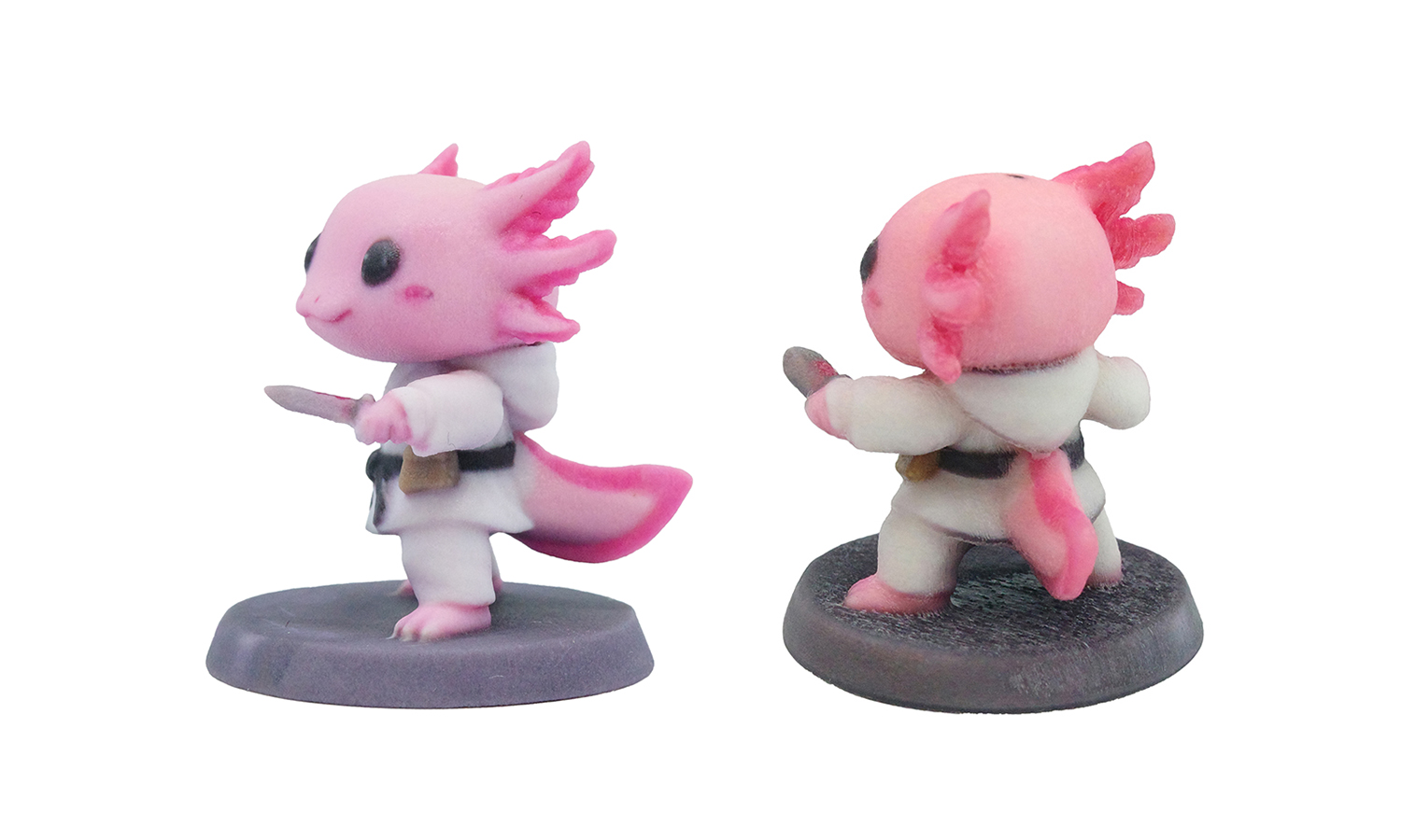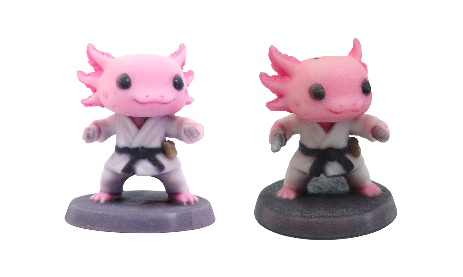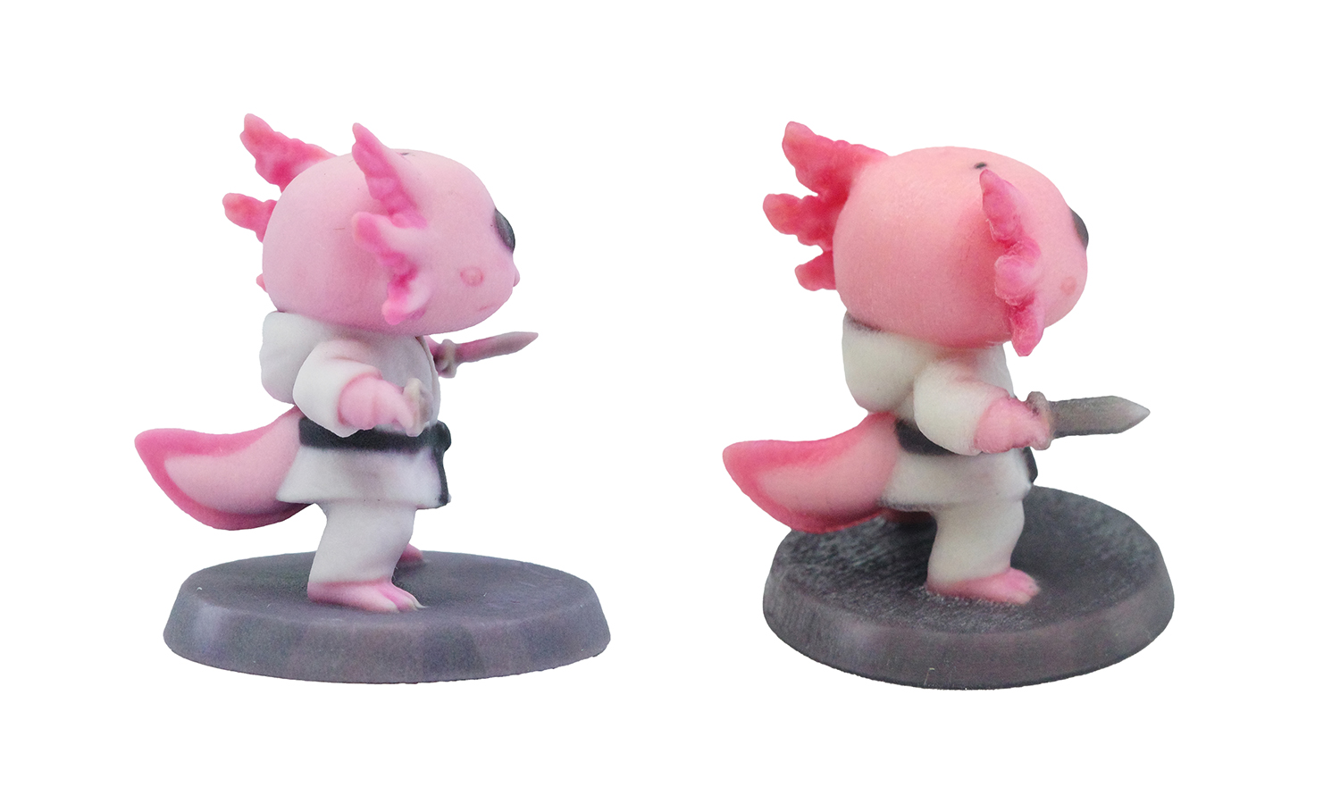 This comparison features a cute Axolotl martial artist printed using two full-color resin technologies: