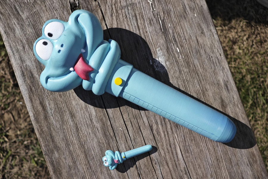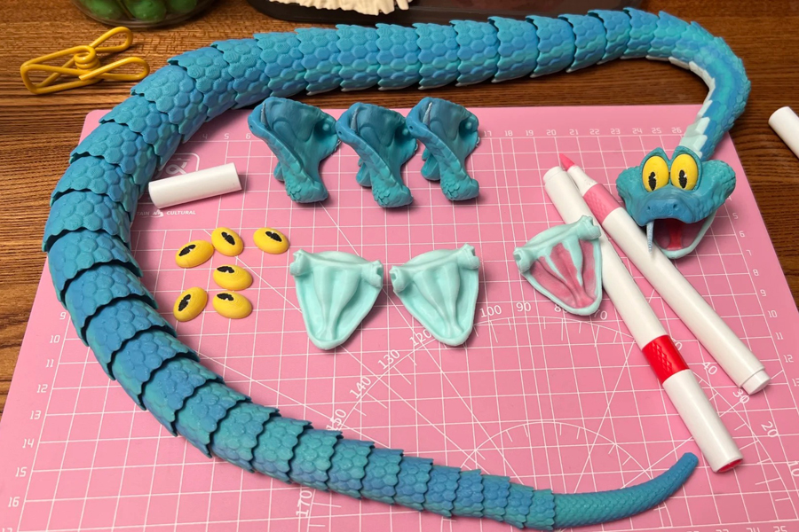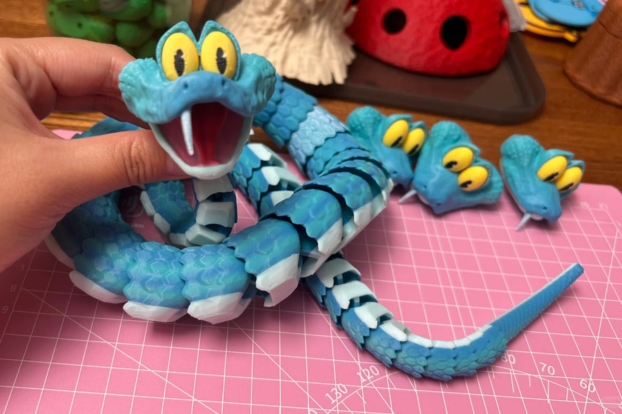 The fan printed Gary in multiple segments, including interchangeable heads, fangs, eyes, and body sections. After assembly, the model becomes a fully poseable snake with a highly detailed surface—something that FDM printing handles surprisingly well at this scale. The creator finished the piece with layered hand-painting, blending various blues to bring out the depth of the scales and the character’s lively personality.