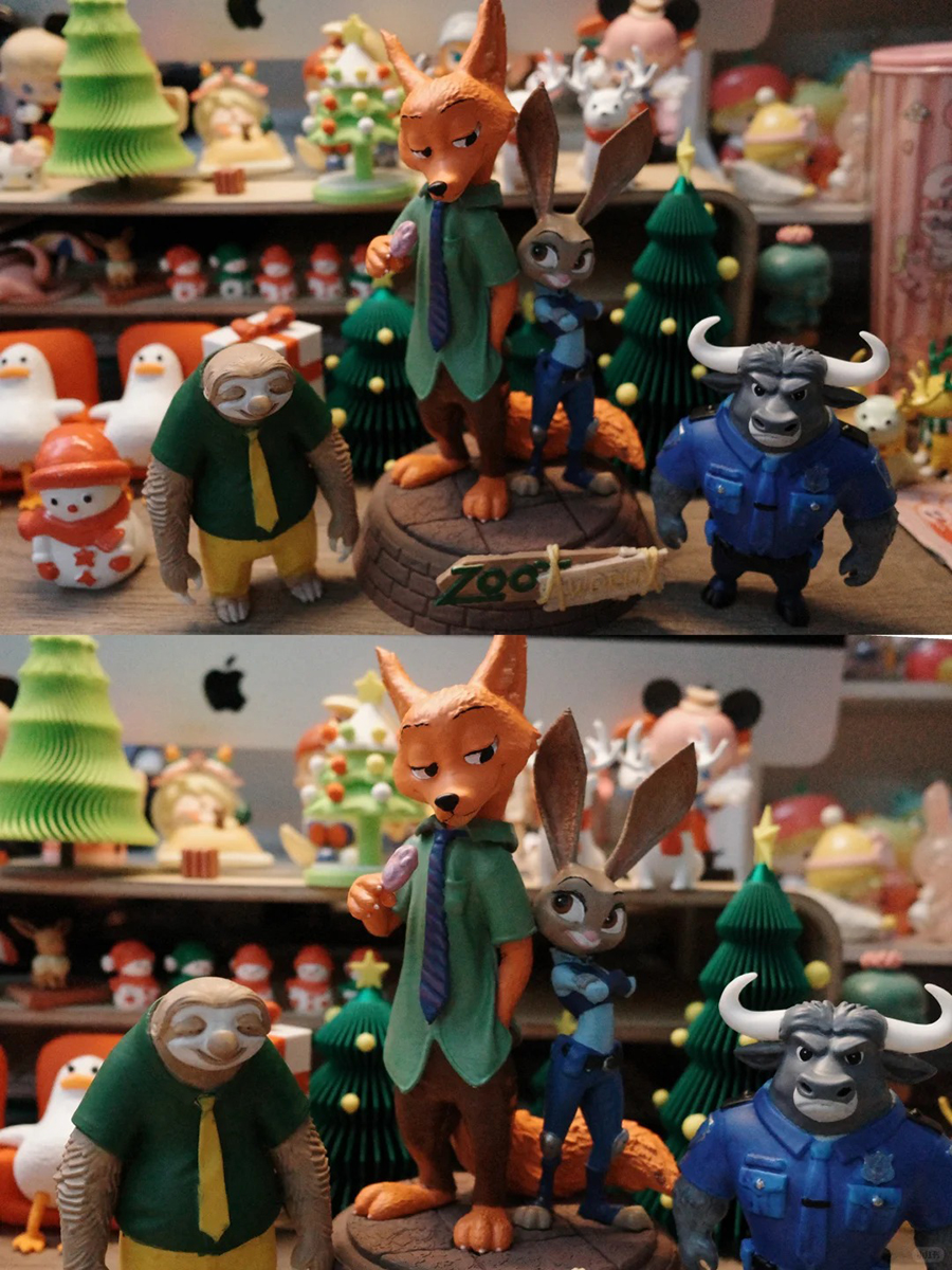 This case brings together a full fan-made Zootopia holiday display, featuring 3D-printed figures of Nick Wilde, Judy Hopps, Flash, and Chief Bogo. Each character is recreated with exaggerated, hand-painted details that capture their personalities—Nick with his signature smirk and popsicle, Judy confidently posed beside him, Flash with his sleepy grin, and Bogo standing solid and stern.