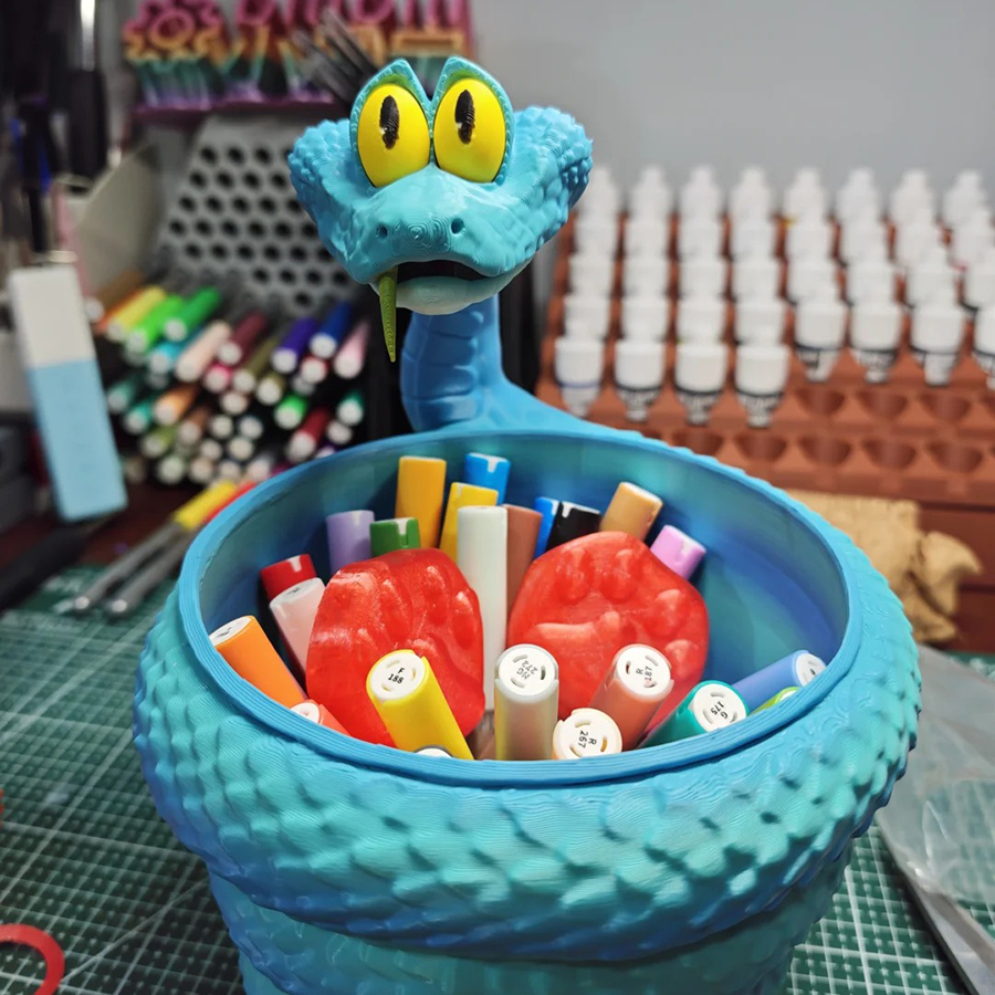 This case showcases another creative fan interpretation of Gary, the expressive blue snake introduced in Zootopia 2. Instead of reproducing his full body or his anti-venom pen, this maker reimagined Gary as a coiled storage container. The design uses his characteristic spiraled body as the bowl, while his elongated neck and curious head rise above it, giving the piece both utility and personality.